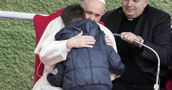ROMA, 15 APR - Bagno di folla per Papa Francesco alla parrocchia di San Paolo della Croce a Corviale, nella periferia ovest della Capitale. Ad accogliere Papa Bergoglio sono stati l'arcivescovo vicario Angelo De Donatis, il vescovo ausiliare per il settore Ovest monsignor Paolo Selvadagi e il parroco don Roberto Cassano. Il pontefice, prima della messa, ha incontrato i bambini del catechismo, poi gli anziani, gli ammalati e i poveri. Il momento più commovente c'è stato quando ha abbracciato un bambino orfano. Non ce l'aveva fatta il piccolo a pronunciare davanti a Papa Francesco e a tutti gli altri bambini del catechismo la domanda che aveva preparato assieme al parroco. Davanti al microfono, venuto il suo turno di rivolgere una domanda al Papa, ha cominciato a piangere coprendosi il viso con le mani tanto che Bergoglio lo ha incoraggiato a salire i gradini che li separavano e ad andargli incontro. Il Papa lo ha abbracciato e lo ha assicurato che il papà, ateo, è in Cielo.