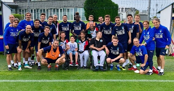 TORINO, 3 GIU - Foto di gruppo, oggi a Vinovo, per l'Italia di Roberto Mancini e la Nazionale Italiana dell'Amicizia (Nida). Alla vigilia dell'amichevole con l'Olanda, una rappresentanza della Onlus, che ha come impegno primario l'assistenza ai minori in difficoltà, è stata ricevuta nel ritiro degli azzurri, che hanno dato la possibilità ad alcuni ragazzi seguiti dall'associazione di assistere all'allenamento. "Ringrazio il ct Mancini, il suo staff e tutti i giocatori per la sensibilità e l'attenzione che ci hanno dimostrato", racconta Walter Galliano, che della Nazionale Italiana dell'Amicizia è il capitano. "I calciatori - dice - sono stati fantastici, hanno firmato autografi, fatto foto e, soprattutto, ci hanno consentito di assistere all'allenamento". Un sogno che si avvera per questi ragazzi e che potrebbe continuare: "abbiamo proposto una sorta di 'gemellaggio' - spiega - per consentire ai ragazzi che seguiamo in tutta Italia di incontrare i loro beniamini in tutte le città in cui gli azzurri giocheranno".