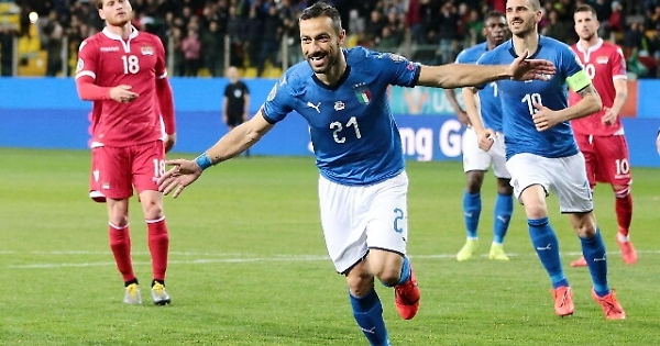 ROMA, 26 MAR - Standing ovation di tutto il pubblico del 'Tardini' di Parma al 27' st di Italia-Liectenstein, per tributare il meritato omaggio a Fabio Quagliarella, sostituito dal ct Mancini con Pavoletti. In precedenza il bomber azzurro era diventato il più anziano marcatore nella storia della Nazionale, con i suoi 36 anni e 54 giorni e segnando un rigore al 35' pt della sfida di oggi delle qualificazioni europee. Successivamente il n.21 ha fatto doppietta trasformando un altro penalty nei minuti di recupero. A completare una serata trionfale Quagliarella ha poi fornito, di testa, l'assist decisivo a Kean per la rete azzurra del 5-0. Prima di Quagliarella il marcatore azzurro più anziano era stato Christian Panucci con 35 anni e 62 giorni quando era andato a segno, il 13 giugno del 2008, contro la Romania.
