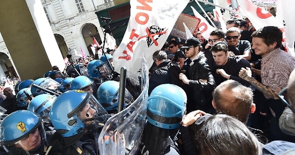 TORINO 1 MAY - Tensione altissima al corteo di Torino quando la polizia ha fermato e allontanata lo spezzone con migliaia di No Tav. I manifestanti hanno risposto lanciando bottiglie lattine aste di bandiere tazze. Il movimento No Tav è stato portato indietro di due isolati rispetto a piazza San Carlo dove si teneva il comizio sindacale.