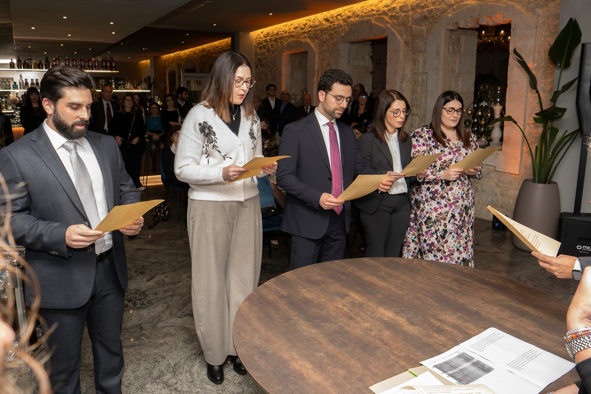 Momento centrale della serata è stato il giuramento dei nuovi iscritti: Antonio Attinelli, Giuseppe Dipasquale, Riccardo Iudice, Raffaella Ragusa, Irene Sammito e Pamela Sinacciolo, chiamati a manifestare pubblicamente dedizione e responsabilità verso la professione. Il presidente Attinelli ha quindi consegnato personalmente ai nuovi membri il kit di benvenuto, augurando a ciascuno un cammino ricco di soddisfazioni e traguardi.
