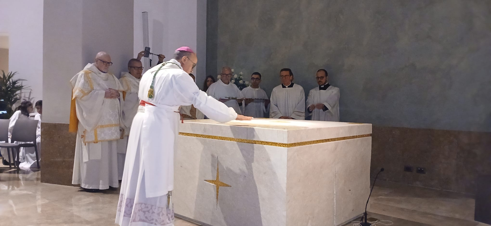 Il momento più intenso è stato il rito di dedicazione dell’altare, consacrato con l’unzione del crisma e avvolto dal profumo dell’incenso. Un gesto dal forte significato simbolico, che ha restituito alla chiesa il suo cuore liturgico: l’altare come luogo del sacrificio eucaristico, mensa della comunione e segno vivo della presenza di Cristo.