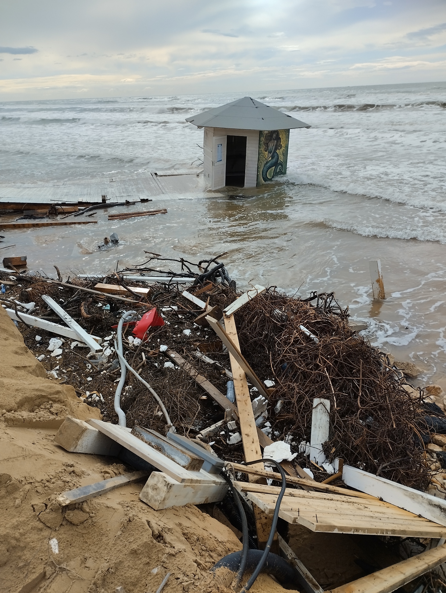 A Cirica, la tempesta ha distrutto gran parte di quanto, nel tempo, è stato consentito realizzare su particelle private a ridosso della battigia: eliminazione della vegetazione naturale, chiusura di porzioni di arenile con materiali e modalità incompatibili con il pregio del luogo e conseguente degrado ambientale. Oggi l’area appare completamente sventrata, con in evidenza i materiali più disparati – pavimentazioni in legno, elettrodomestici, tettoie, relitti di imbarcazioni, reti, rivestimenti plastici, servizi igienici, serbatoi idrici, fosse Imhoff, arredi e altro ancora – sparsi sulla spiaggia come una discarica a cielo aperto.
