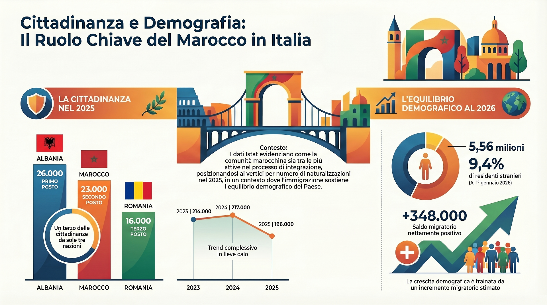 La notizia è stata accolta con grande risalto e con una sorpresa favorevole dalla stampa marocchina, soprattutto se letta in un quadro generale di flessione. L’Istat certifica infatti che il numero complessivo di stranieri che hanno acquisito la cittadinanza italiana è sceso a 196.000 nel 2025, in calo rispetto al 2024 (217.000) e al 2023 (214.000). Trovarsi ai vertici in una fase di contrazione testimonia la stabilità, il radicamento e la forte propensione all’integrazione della diaspora marocchina.