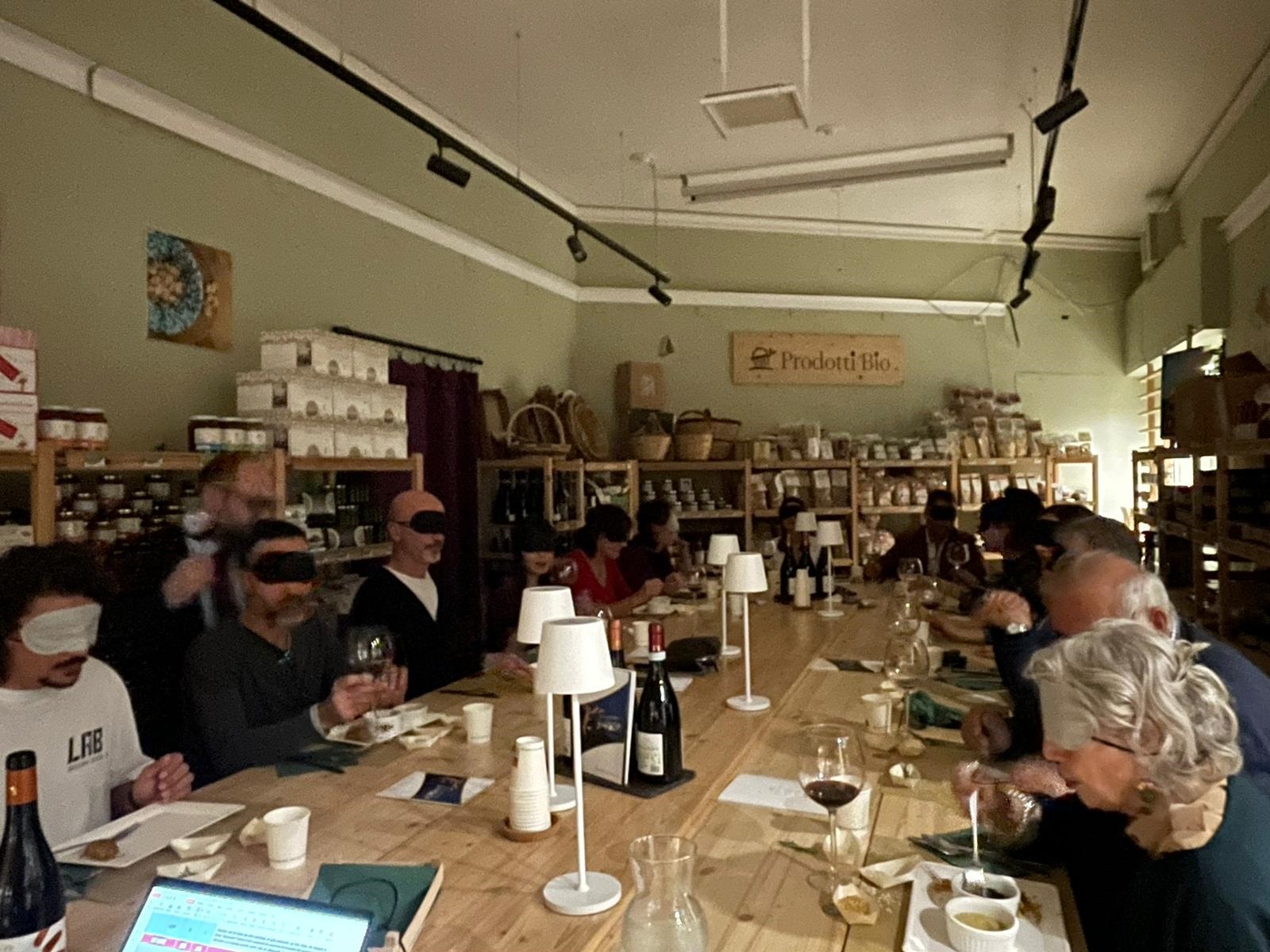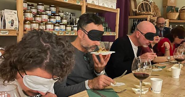 La prima “prova” è stata distinguere delle lenticchie in tre consistenze: purea, stufate e in polpetta, un “gioco” che ha messo in difficoltà più di un commensale. I conti si fanno - letteralmente - alla fine della cena con una scheda di autovalutazione in cui ognuno scrive cosa crede di aver mangiato e poi “spunta” con l’aiuto della cuoca, tutti gli errori fatti. Non senza aver evitato le forche caudine di un finto dolce, servito però senza benda, in modo da dimostrare quanto la vista possa essere ingannevole.