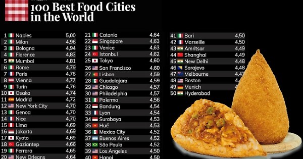 Nella classifica ci sono al 4° posto Firenze, poi Roma al 6°, Torino al 9°, al 13° Genova, al 19° Ferrara, a confermare che la tradizione e la varietà culinaria italiane sono amate tantissimo e sono i piatti "da provare" per chi viene in vacanza nel nostro Paese. Ma ci sono anche sorprese o scelte opinabili, come spesso accade in queste classifiche internazionali, ad esempio Milano che supera Bologna!!!! e pure Roma! Ferrara più in alto della Sicilia. E chi avrebbe immaginato Jakarta come una capitale del gusto?!