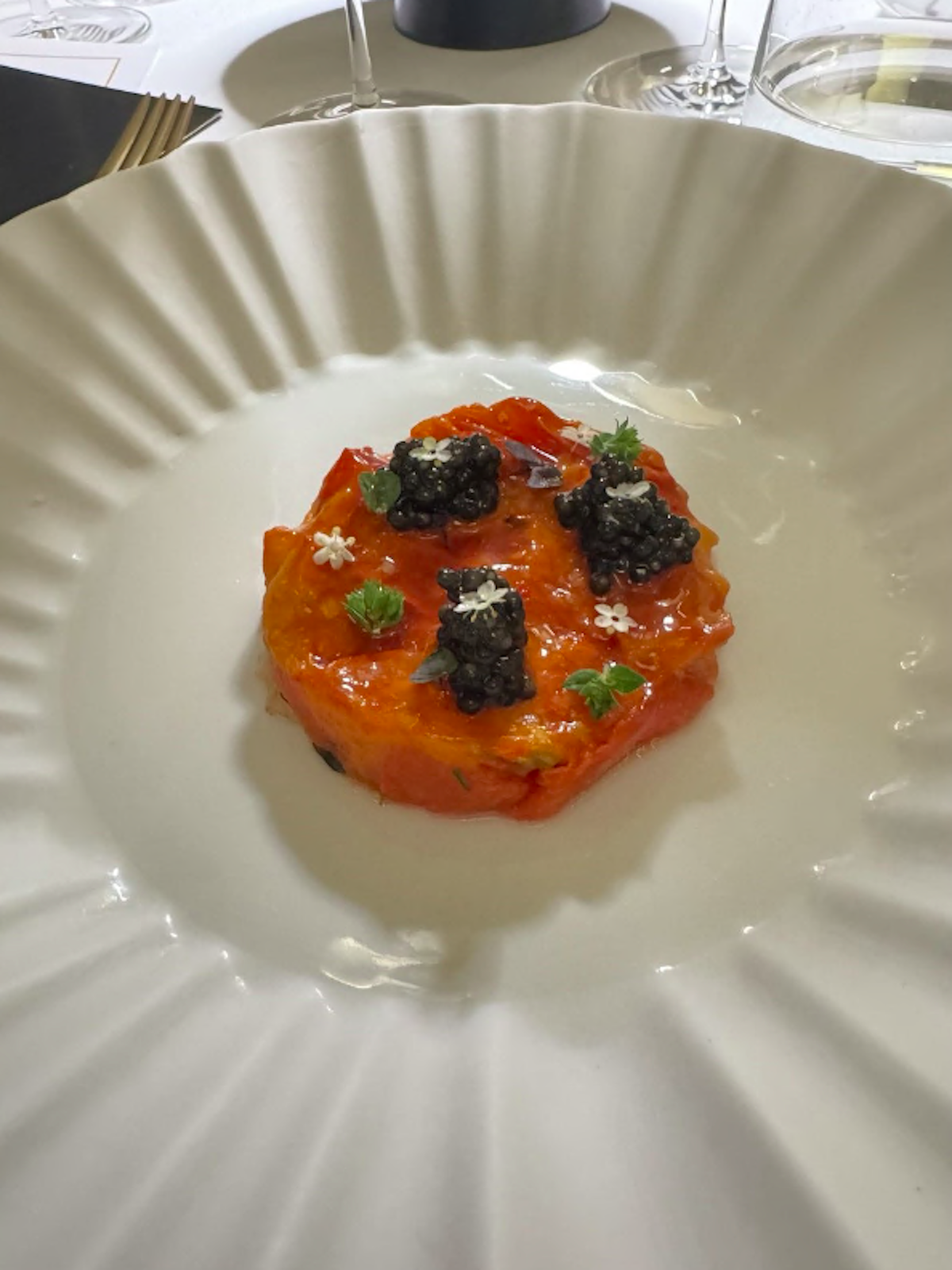 Il secondo piatto, pomodoro cuore di bue fermentato con maionese vegetale, sgombro affumicato, croccante di Tumminia, è una creazione particolarmente cara allo chef, nata come omaggio al padre. In occasione dell’evento, è stata presentata in una versione esclusiva con l’aggiunta del caviale: una dichiarazione di stile intima e attuale, dove fermentazione e sapidità si incontrano con naturalezza.