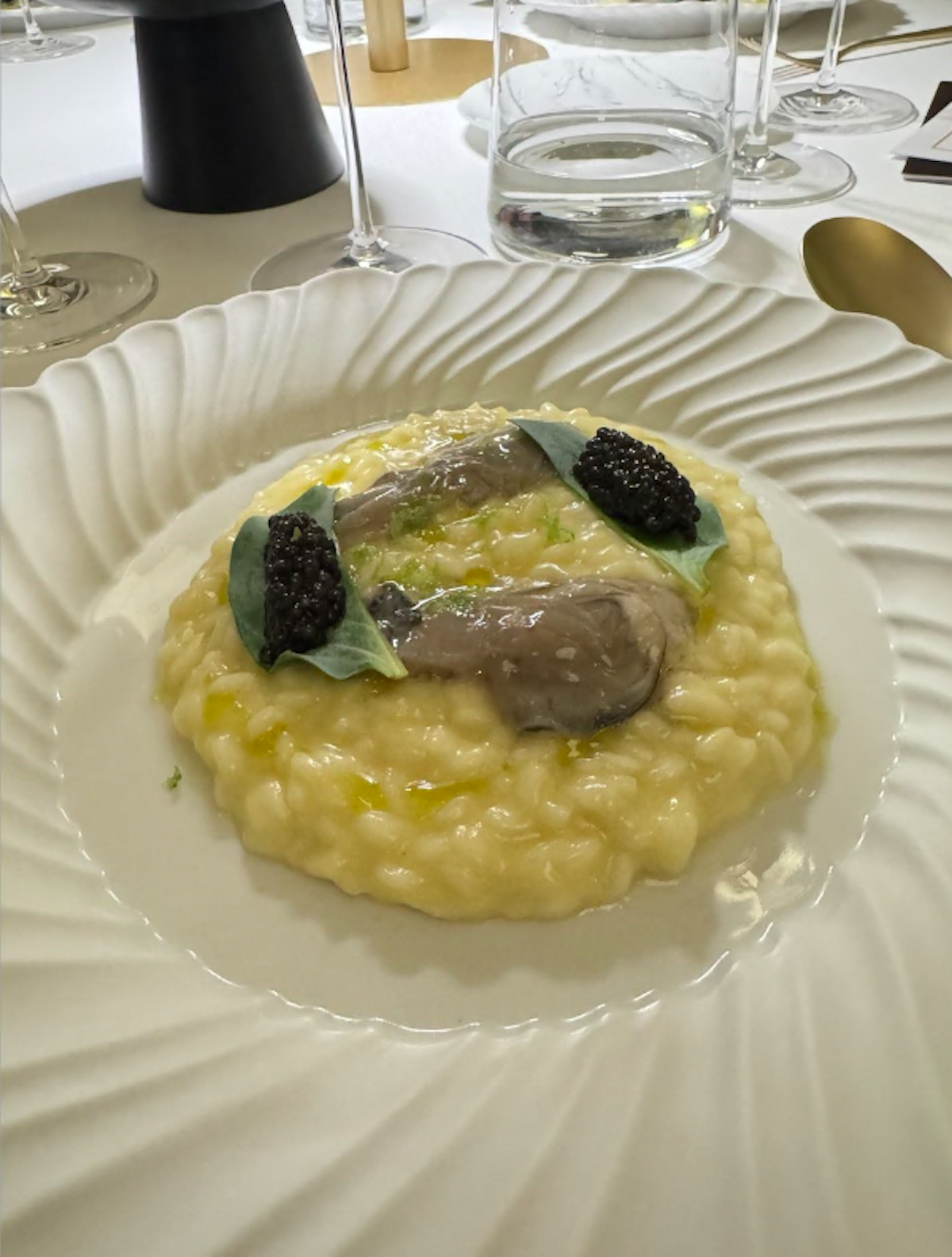 Il primo piatto è freschezza ma con note inaspettate: riso Carnaroli Gallo Extra con limone verdello di Marineo, ostriche Daniel Sorlut, caviale e gin.
