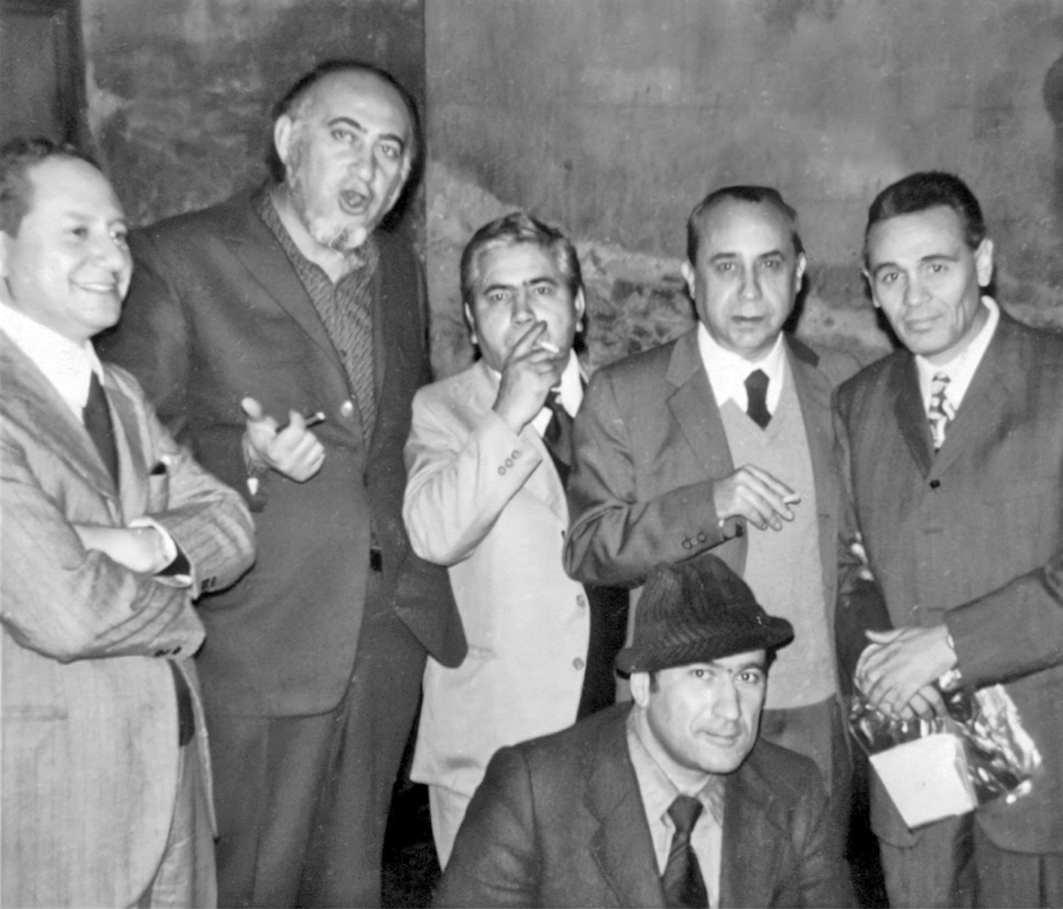 Da sinistra: Vito Cavallotto, Natale Tedesco, Santo Marino, Leonardo Sciascia, un altro ospite, Mario Grasso (col cappello)