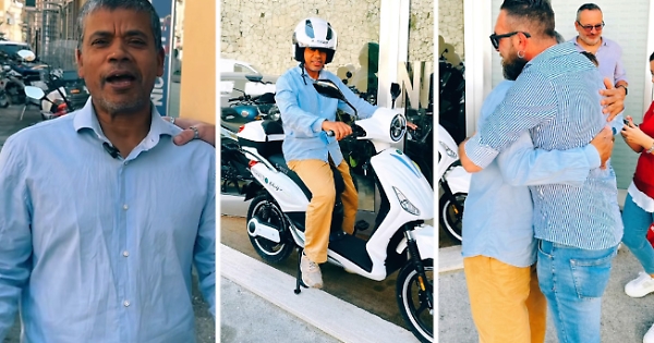 Due giorni fa gli avevano rubato il motorino elettrico con cui lavorava in giro per la città come venditore ambulante di rose, riuscendo a farsi apprezzare e farsi voler bene da tutta Caltanissetta. E nel momento in cui ha avuto bisogno, la città ha risposto: raccogliendo in poche ore i soldi necessari per acquistare il nuovo mezzo. Così stamattina, davanti alla concessionaria di Giuseppe Nicoletti, c'è stata una grande festa per la consegna dello scooter a pedali ad Abdul Basid, 39enne originario del Bangladesh, ma per tutti i nisseni solo Rosario.