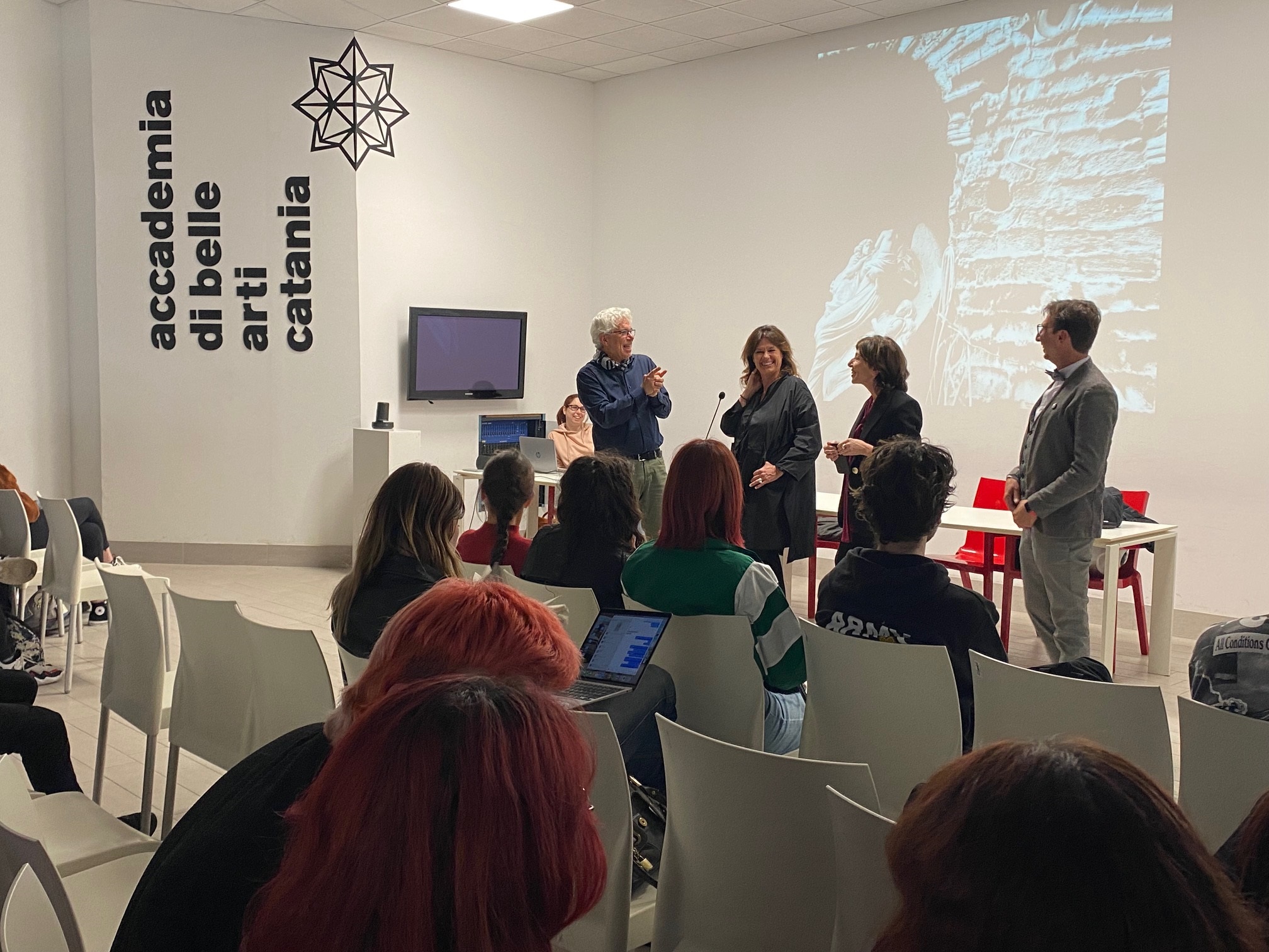 Accolta dalla presidente Lina Scalisi, dal direttore Gianni Latino e dai docenti Ambra Stazzone e Rosario Antoci (prodirettrice e membro cda), la senatrice Gallone ha incontrato professori e allievi impegnati in aule e laboratori della sede inaugurata tre anni fa. Tappe in aula magna durante la lezione di Fotografia del prof. Carmelo Bongiorno, nell’aula laboratorio di Nuove Tecnologie dell’Arte dove i docenti Anna Crocellà e Riccardo Guttà stavano ultimando con gli studenti la stampa 3D in miniatura della celebre Panton Chair, progettata nel 1959 del designer Verner Panton. Studenti e allievi del corso di NTA sono in partenza per il Salone del Mobile di Milano per conoscere da vicino tutte le novità del settore. In biblioteca Gallone ha incontrato gli allievi di design e comunicazione impegnati con il prof. Marco Lo Curzio in un progetto espositivo in collaborazione con un’associazione territoriale e poi è stata in aula di grafica con la prof. Rachele Romano. Infine tappa nei laboratori di fashion design con la professoressa Sabina Albano al lavoro con alcune allieve su collezioni primavera estate con il tessuto denim.