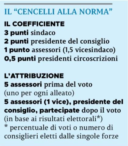 Alla fine, dopo qualche discussione accesa, prevale il buon senso. Misto all’ottimismo spinto («queste elezioni non le vinciamo, le stravinciamo») che non fa perdere di vista la «necessità di non dare l’impressione di una coalizione che litiga per le poltrone». E dunque, grazie anche ai lucidi consigli dei più esperti in materia spartitoria, si arriva a una mediazione che, in prospettiva, magari non metterà tutti d’accordo, ma ridurrà al minimo gli scontenti. L’idea è attribuire un “coefficiente” di importanza a ogni posto. Ad esempio: 3 al sindaco, 2 al presidente del consiglio comunale, 1 agli assessori (1,5 al vice), 0,5 ai presidenti di circoscrizione e via spartendo. Dunque: si parte con «pari dignità per tutte le forze» e, in base ai risultati (si dovrà decidere se col criterio della percentuale di voti o con quello dei consiglieri eletti) si redistribuiranno gli altri cinque assessorati, i vertici consiliari e le partecipate. Il “Cencelli alla Norma”, insomma, è già servito. Sulle porzioni, ancora, c’è da lavorare.