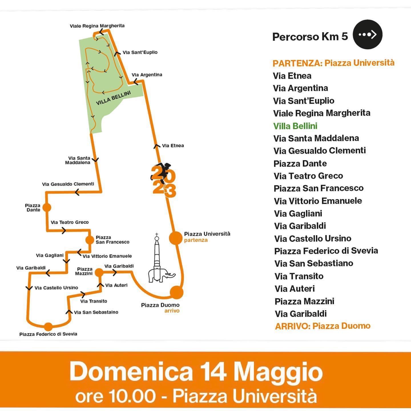 IL PERCORSO. Il percorso di Corri Catania 2023 scatterà da piazza Università, cuore pulsante dell’evento dove, a partire da giovedì 11 maggio sarà allestito il Corri Catania Village, e si snoderà lungo via Etnea, via Argentina, via Sant’Euplio, viale Regina Margherita, Villa Bellini, via Santa Maddalena, via Gesualdo Clementi, piazza Dante, via Quartarone, via Teatro Greco, piazza San Francesco, via Gagliani, via Garibaldi, via Castello Ursino, piazza Federico di Svevia, via San Sebastiano, via Transito, via Auteri, piazza Mazzini, via Garibaldi per arrivare in piazza Duomo e poi far ritorno in piazza Università dove si svolgerà la festa finale.