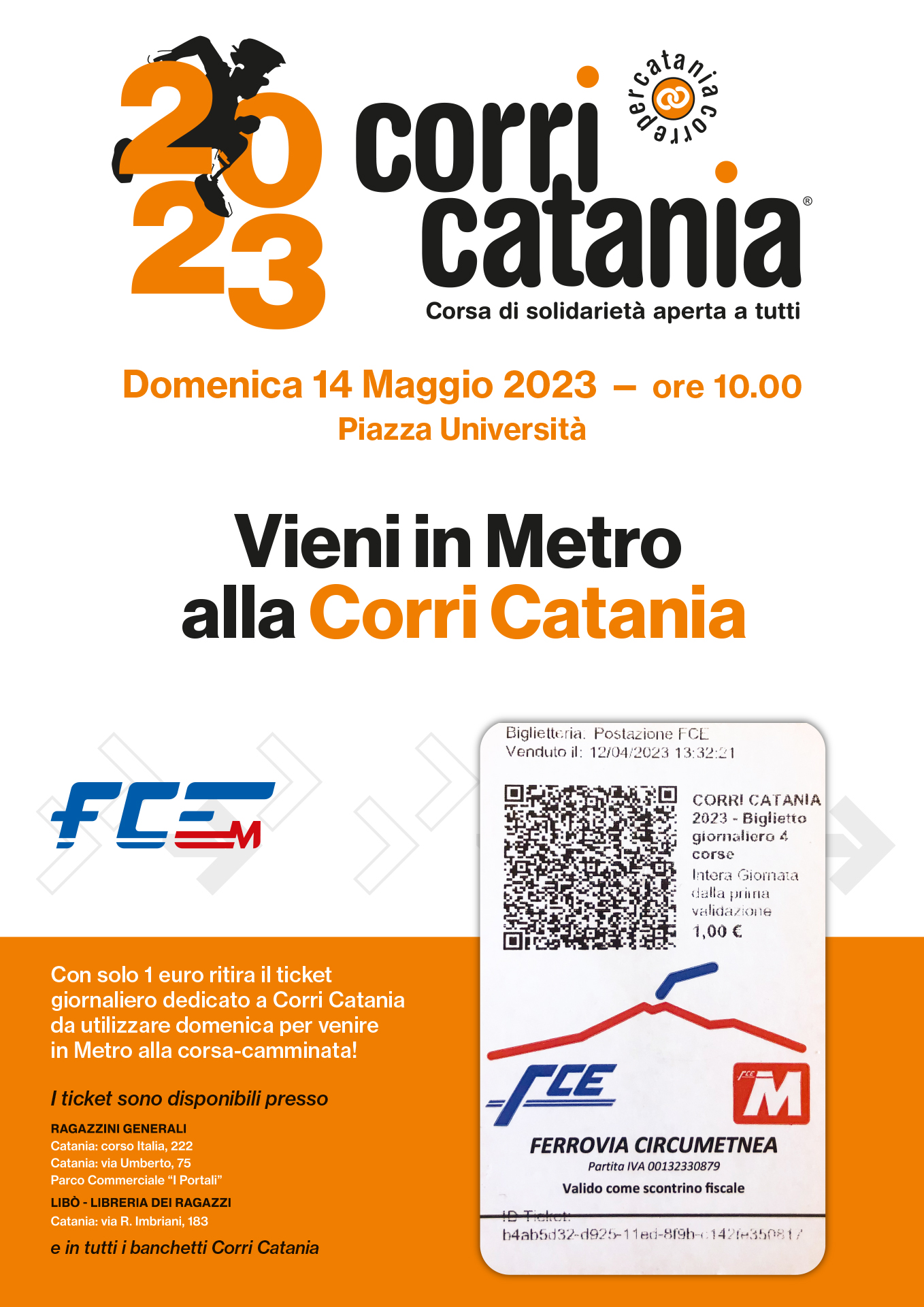 "VIENI IN METRO ALLA CORRI CATANIA”. E si rinnova anche nel 2023 una bella iniziativa della Metropolitana di Catania nel segno della solidarietà e della mobilità sostenibile: “Vieni in Metro alla Corri Catania”. Nei Corri Catania Point Ragazzini Generali (Corso Italia 222, Via Umberto 73 e c/o CC I Portali); Libò Libreria per Ragazzi (via R. Imbriani 183) e nei banchetti promozionali dell’evento, con solo 1 euro è possibile ritirare il ticket giornaliero, comprensivo di 4 corse, da utilizzare il 14 maggio per recarsi in Metro alla corsa-camminata. Il ricavato sarà destinato al progetto “Auto per la Salute”.