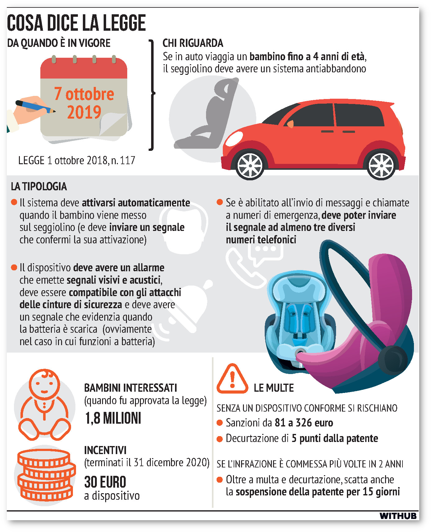 Nel 2019 il Parlamento approvò il decreto sull'obbligo dei seggiolini antiabbandono in auto, provvisti cioè di un allarme acustico per ricordarsi della presenza del bimbo in auto. Un provvedimento, la cui prima firmataria era Giorgia Meloni, che è entrato in vigore il 7 novembre 2019 e che prevedeva l'obbligatorietà per i bambini al di sotto dei quattro anni. I dispositivi, oltre agli allarmi visivi e sonori, possono essere anche collegati agli smartphone dei genitori attraverso apposite app.
