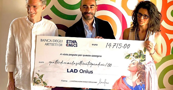 Un maxi assegno da 14.715 euro. È quello che lo staff di Etna Comics, con in testa il direttore Antonio Mannino, ha consegnato a Emilio Randazzo e Cinzia Favara Scacco, fondatori di WonderLAD, la casa-laboratorio che accoglie i bambini affetti da gravi patologie. La somma, provento dell’asta di beneficenza dell’ultima edizione del Festival internazionale del fumetto, del gioco e della cultura pop, è già stata versata tramite bonifico ed è la più alta mai raccolta, nel complesso, nella storia della kermesse.