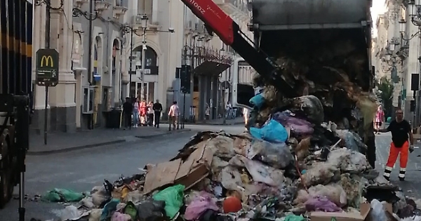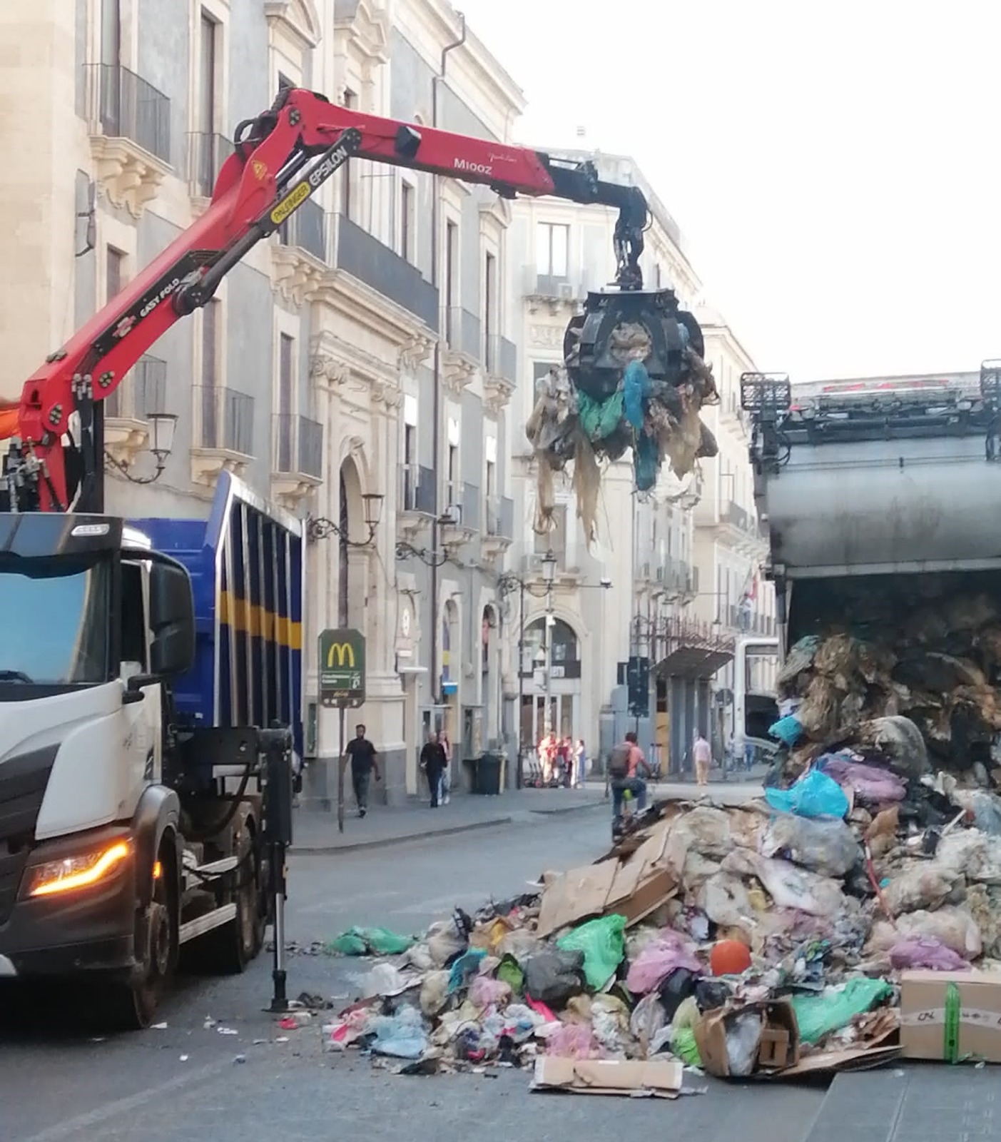 Catania, autocompattatore costretto a scaricare una montagna di rifiuti in via Etnea: ecco cosa è successo