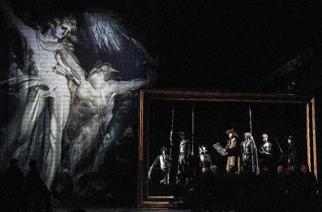 «Sul piano visivo adotto una cifra metafisica. L’incontro tra le due epoche si realizza in una sala vuota – forse un museo – dove le cornici dei quadri si alternano in un viaggio speculare che fa riflettere il mondo, tra Ottocento e Novecento, nella storia seicentesca dei Puritani. C’è in scena una moltitudine silenziosa vestita di nero, il coro greco di un pubblico a lutto per la morte del Cigno, che osserva e viene osservato in un continuo scambio di prospettiva temporale. Ho messo in evidenza dettagli di opere del pittore inglese Füssli che, pur appartenendo a un’epoca, anticipa le psicosi, il disturbo mentale, l’inconscio freudiano. Nel finale i puritani vittoriosi incendiano le cornici. Ci vedo le censure di tutti i tempi, la tracotanza di chi pensa di stare dalla parte giusta, e financo la deriva della cancel culture. Ma a spegnere le fiamme interverrà lo stesso Bellini, calando dall’alto come un deus ex machina, a ristabilire l’olimpica eternità dell’Arte».