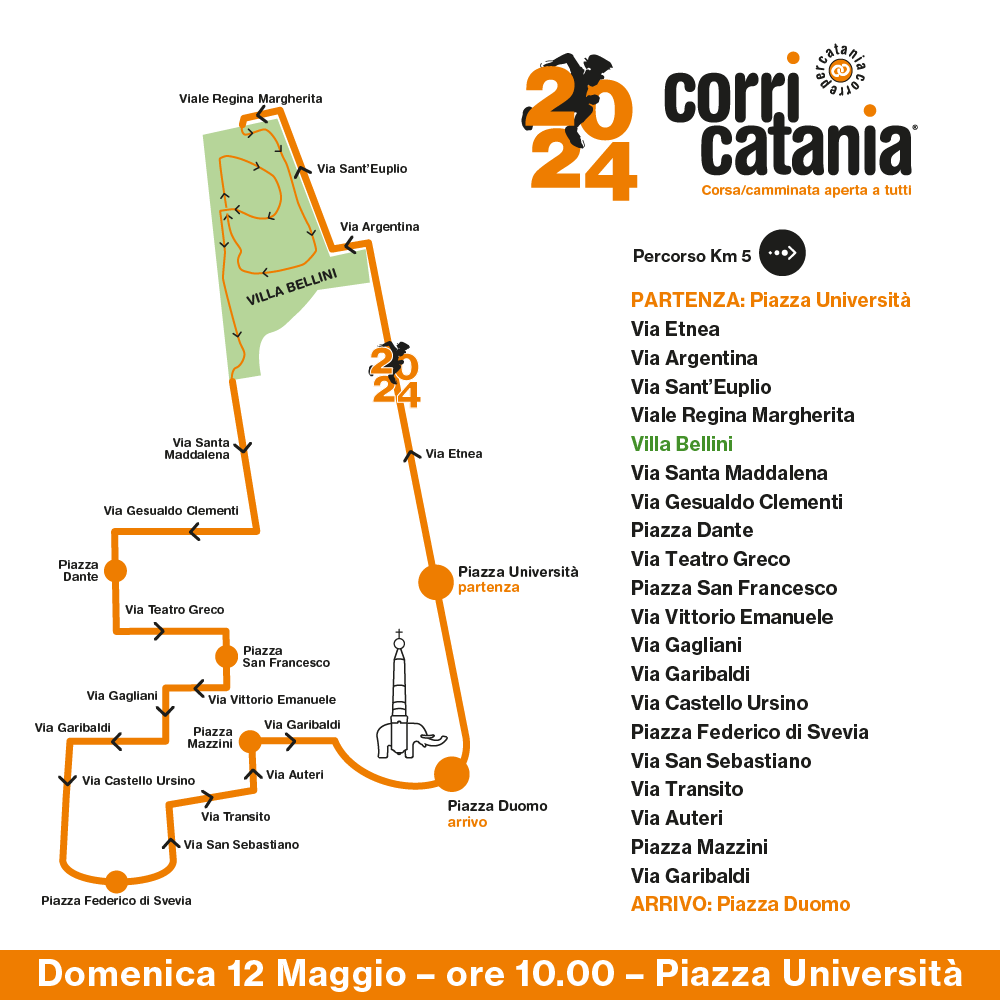 IL PERCORSO: 5 KM CORRENDO O CAMMINANDO. Indossando la maglietta bianca simbolo dell’evento, un serpentone festante si snoderà lungo il percorso di 5 km che da piazza Università, dove a partire da giovedì 9 maggio sarà allestito il Corri Catania Village, si muoverà lungo via Etnea, via Argentina, via Sant’Euplio, viale Regina Margherita, Villa Bellini (Piazzale delle Carrozze e viale degli Uomini Illustri), via Santa Maddalena, via Gesualdo Clementi, piazza Dante, via Quartarone, via Teatro Greco, piazza San Francesco, via Gagliani, via Garibaldi, via Castello Ursino, piazza Federico di Svevia, via San Sebastiano, via Transito, via Auteri, piazza Mazzini, via Garibaldi per arrivare in piazza Duomo e poi far ritorno in piazza Università dove si svolgerà la festa finale.