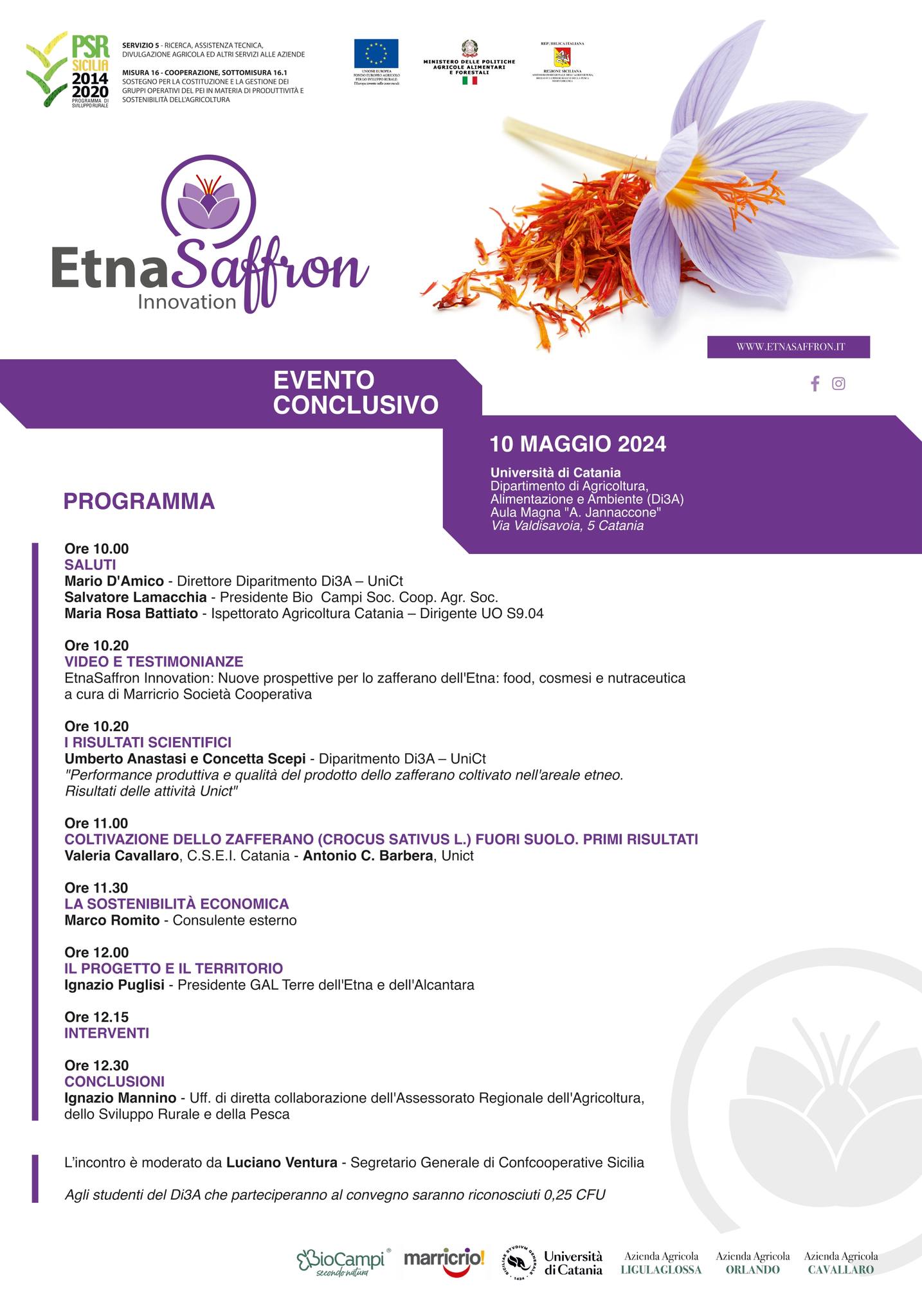 Alle 10,30 saranno divulgati i risultati scientifici; interverranno Umberto Anastasi e Concetta Scepi del Dipartimento Di3A sul tema "Performance produttiva e qualità del prodotto dello zafferano coltivato nell'areale etneo. Risultati delle attività UNICT". Alle 11 sarà la volta di “Coltivazione dello zafferano (Crocus sativus L.) fuori suolo. Primi risultati”, a cura di Valeria Cavallaro, C.S.E.I. Catania e Antonio C. Barbera, UniCt. Alle 11,30 sarà affrontato il tema della sostenibilità economica con il consulente esterno Marco Romito.