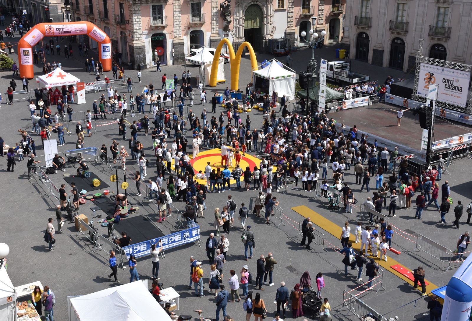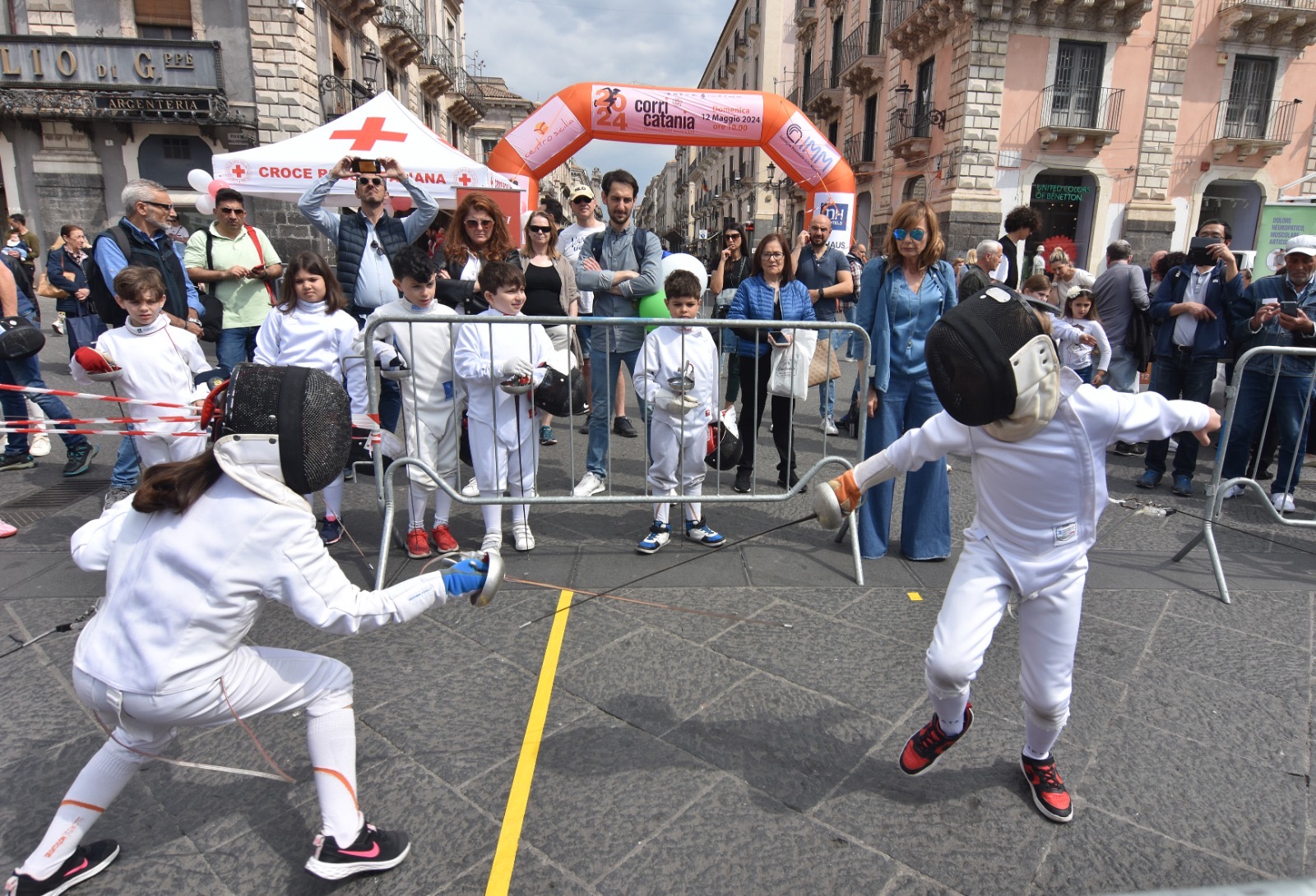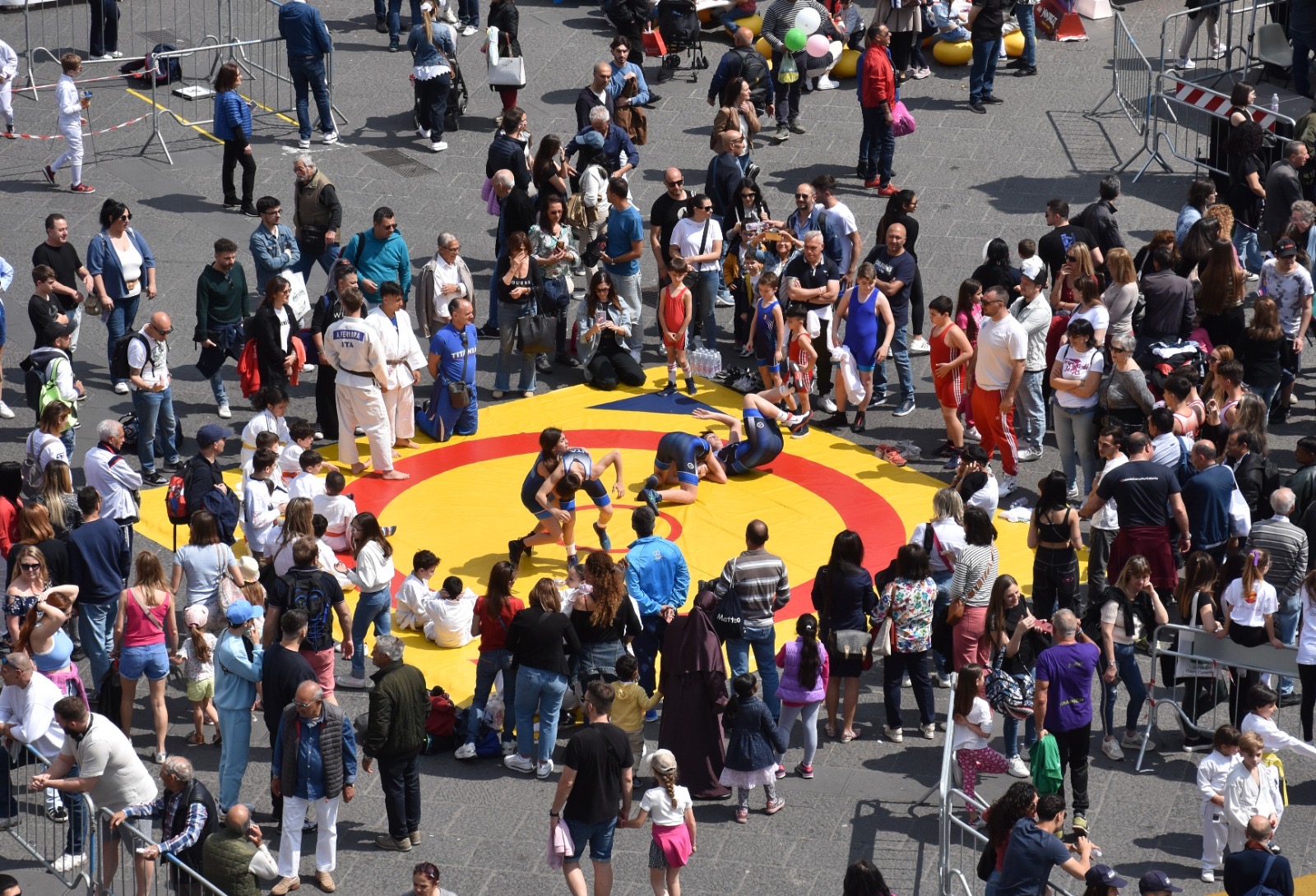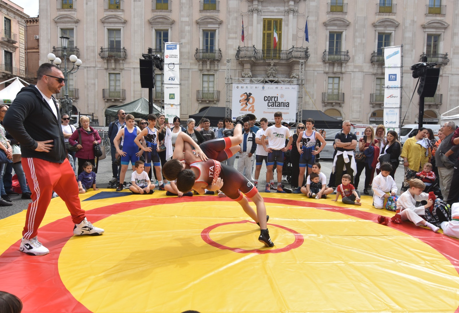 CORRI CATANIA VILLAGE. E ieridopo l’apertura ufficiale di giovedì, Piazza Università, il salotto buono della nostra città, è diventata una palestra a cielo aperto con esibizioni di lotta con in azione piccoli e grandi talenti della Lotta Club Jonio Catania del maestro Salvatore Campanella, affiancato dai tecnici Daniele Ficara e Antonino Giangreco; lo judo con l’Asd Titania Catania con in testa il maestro Gaetano Spata; il karate con il gruppo Altair del maestro Mattia Agatino e ancora la scherma con la Catania Fencing la società dell'azzurro Gianpaolo Buzzacchino e presente anche il delegato provinciale Vera Pistone.