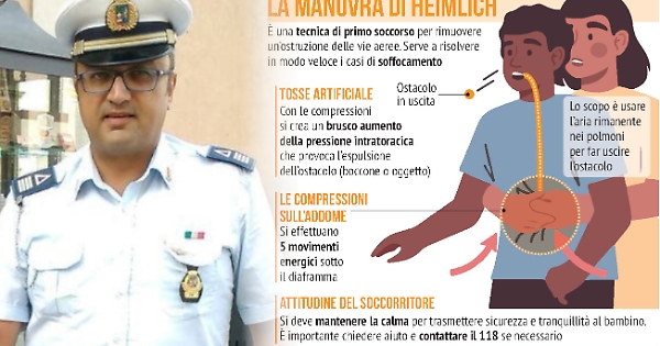 Il bimbo ha ripreso subito a respirare mentre il vigile ha continuato a comprimergli l’addome fino a quando dalla bocca non è venuto fuori quel pezzetto di pane che gli ostruiva la gola.