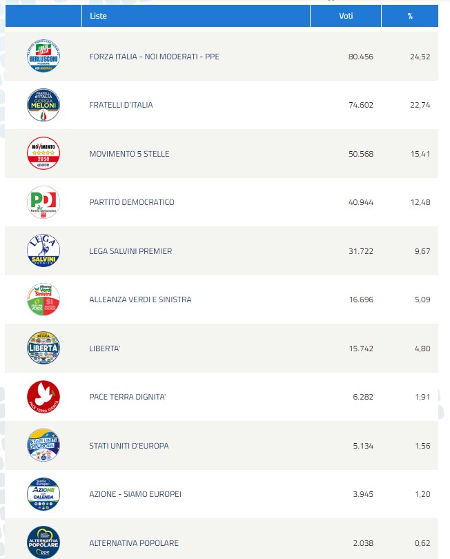 Nella provincia di Catania quando sono state scrutinate tutte le 1.126 sezioni il voto per le Europee ha visto Forza Italia davanti Fratelli d’Italia: la lista azzurra con 80.456 voti ha raggiunto il 24,52% dei voti contro il 22,74% di Fratelli d’Italia (74.602). Nel centrosinistra il M5S supera il Pd: 15,4% (50.568 voti) contro il 12,4% dei Dem (40.944). La Lega crolla al 9,6% (31.722). Avs arriva al 5% (16.696 voti), Libertà di De Luca si ferma al 4,8% (15.742). Malissimo tutte le altre liste: Pace Terra e Dignità 1,91% (6.282), Stati Uniti d’Europa di Renzi e Bonino 1,56% (5.134), Azione di Calenda 1,2% (3.945) e Alternativa Popolare 0,62% (2.038).