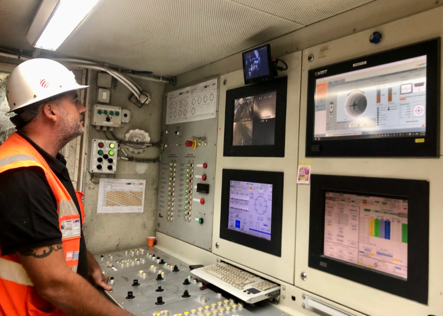 Come funziona? La talpa scava e scarica il materiale asportato che viene portato in superficie attraverso una coclea e un sistema di nastri. È tutto materiale che viene riutilizzato. Se argilla, come in questo caso, viene usata come riempimento di cave dismesse. Ogni 1,80 metri la talpa si ferma per consentire il montaggio dei conci (prodotti a Belpasso) iniettando prima una speciale resina tra la parete e il concio, e poi si riprende. Si va avanti così, a ciclo continuo, sotto l'attento controllo della “sala di comando” che verifica e gestisce in ogni istante ogni parametro sia nella “camera di scavo”, tra il fronte di scavo e la testa della talpa e a pressioni di 2,25-2,30 bar dove gli operatori vanno solo per le periodiche manutenzioni, sia nella fase di montaggio degli “anelli”, con i conci che vengono prelevati tramite una ventosa e posizionati secondo un preciso ordine. Operazioni delicate ed eseguite sotto stretto controllo, per la futura sicura mobilità sotterranea di Catania.