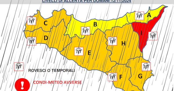 Per domani - secondo il bollettino diffuso dalla Protezione civile siciliana - «si prevede il persistere di precipitazioni da sparse a diffuse, a prevalente carattere di rovescio o temporale, assumendo localmente anche carattere di persistenza sui settori orientali. i fenomeni saranno accompagnati da rovesci di forte intensità, frequente attività elettrica e forti raffiche di vento». Come potete vedere dalla mappa diffusa dalle autorità, su quasi tutta la Sicilia è allerta arancione, solo allerta gialle in due zone della fascia tirrenica e poi l'allerta rossa nella zone costiera nord orientale dell'Isola.