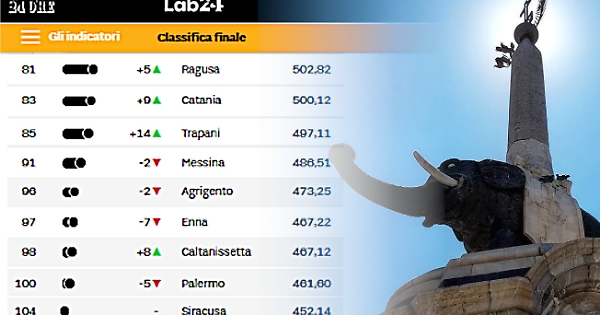 Ormai le città siciliane sono habitué della coda dell'annuale classifica sulla Qualità della Vita del Sole 24 Ore, indagine lanciata nel 1990 per misurare i livelli di benessere nei territori italiani giunta alla 35ª edizione ed i cui risultati sono presentati oggi sulle pagine del quotidiano. La graduatoria segna la vittoria della provincia di Bergamo: mai premiata prima d’ora nella classifica generale, ma già incoronata regina dell’Indice di Sportività 2024, la provincia orobica aveva già scalato diverse posizioni nel 2023 e quest’anno ha scalzato habitué del podio come Trento, al secondo posto, e Bolzano, al terzo.