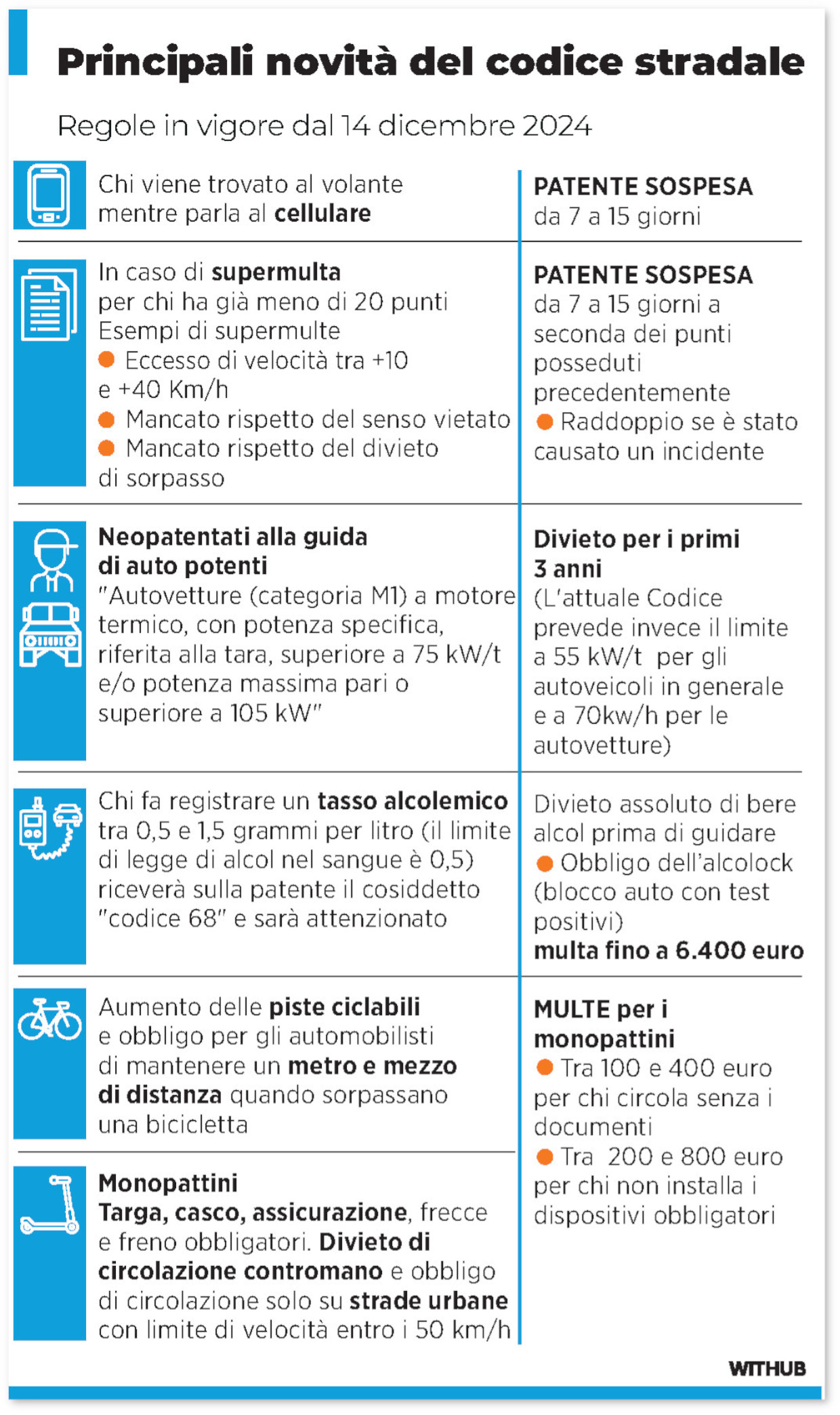«Senza dilungarci, è possibile dare alcune semplici indicazioni sulle novità. Per quanto riguarda la guida in stato di ebbrezza, non vengono modificati i limiti alcolemici e non cambia sostanzialmente l’apparato sanzionatorio, se non per i recidivi. In questo ultimo caso, infatti, per colui che dovesse essere sorpreso alla guida di nuovo con tasso alcolemico superiore a 0,5 g/l entro due anni dalla prima sanzione, oltre alle multe previste, sarà soggetto al divieto di assumere bevande alcoliche prima della guida per un periodo di due o tre anni, in base alla gravità dell’infrazione e dovrà installare in auto il dispositivo “alcolock” che inibirà l’accensione del motore nel caso in cui il guidatore abbia un tasso alcolemico superiore allo zero. Per la guida con il cellulare, chi verrà sorpreso a usare il telefonino al volante, dovrà pagare una sanzione che va dai 250 ai mille euro. Inoltre e questa è una novità, scatterà la sospensione breve della patente, che sarà di sette giorni se il conducente è in possesso un numero di punti della patente superiore di 10 ma inferiore a 20, mentre al di sotto dei 10 punti tale sospensione sarà di 15 giorni. In caso di recidiva, la multa potrà arrivare fino a 1.400 euro, con perdita tra gli 8 e i 10 punti e sospensione della patente da 1 a 3 mesi. In relazione al divieto di fermata e sosta dei veicoli negli spazi riservati agli invalidi, compresi scivoli, raccordi tra marciapiedi e rampe i costi delle sanzioni sono aumentati».