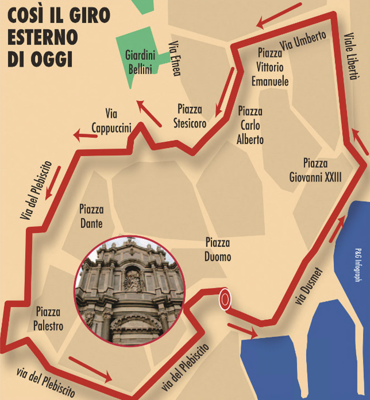 La processione proseguirà per le vie Calì, piazza Cutelli, via Vittorio Emanuele, piazza dei Martiri, dove renderanno omaggio a Sant’Agata i disabili per i quali è stato riservato un apposito spazio. Da qui in via VI Aprile, viale della Libertà, piazza lolanda, dove la processione farà un’altra pausa per ascoltare le riflessioni di Vincenzo Branchina, vicario generale dell’Arcidiocesi.
