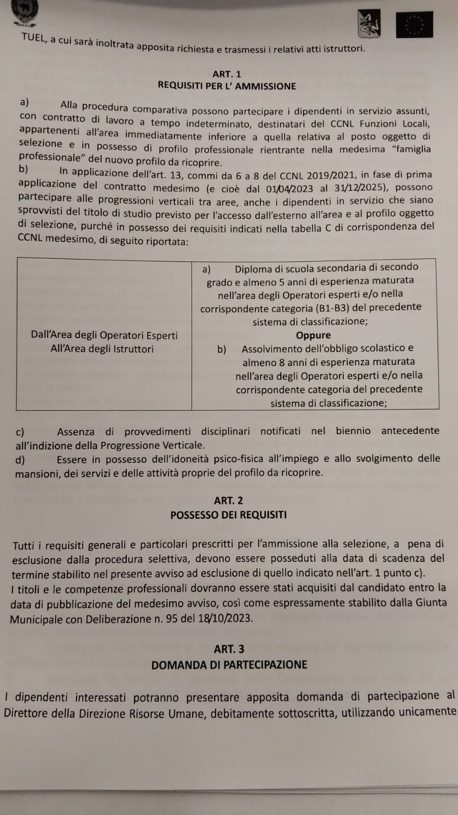 «Tale arbitraria e fantasiosa interpretazione - prosegue Usb -ha danneggiato tutti coloro i quali, correttamente, avevano indicato il diploma quale titolo di accesso alla procedura, omettendo, ovviamente, di indicarlo anche tra i titoli aggiuntivi di cui all’art. 7 e che si trovano quindi penalizzati in graduatoria; Detta interpretazione è palesemente contraria a ogni criterio logico, allo stesso bando e comunque illegittima, poiché l’art. 1 dell’avviso prevede l’accesso alla procedura con il titolo di studio di diploma e solo in via del tutto eccezionale e comunque, in alternativa (“oppure”) con un titolo inferiore e un’anzianità maggiore, sicché, appare evidente che il titolo di diploma assorbe quello dell’obbligo scolastico e che i titoli di diploma valutabili ai sensi dell’art. 7 non possono che considerarsi quelli diversi da quello indicato come titolo di accesso ex art. 1. Tanto è, del resto, confermato anche dall’ Art.6 Valutazione Titoli professionali ulteriori rispetto a quelli previsti per l’accesso alla categoria Verbale di deliberazione della Giunta comunale n. 95 del 18/10/2023».