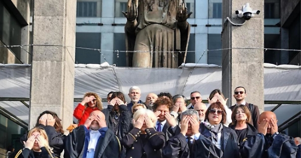 Mani sugli occhi e un minuto di silenzio. È stata questa la protesta (provocazione) messa in campo stamattina alle 8,45 da alcuni avvocati e avvocate del Foro di Catania sulla scalinata del palazzo di giustizia di piazza Verga.
