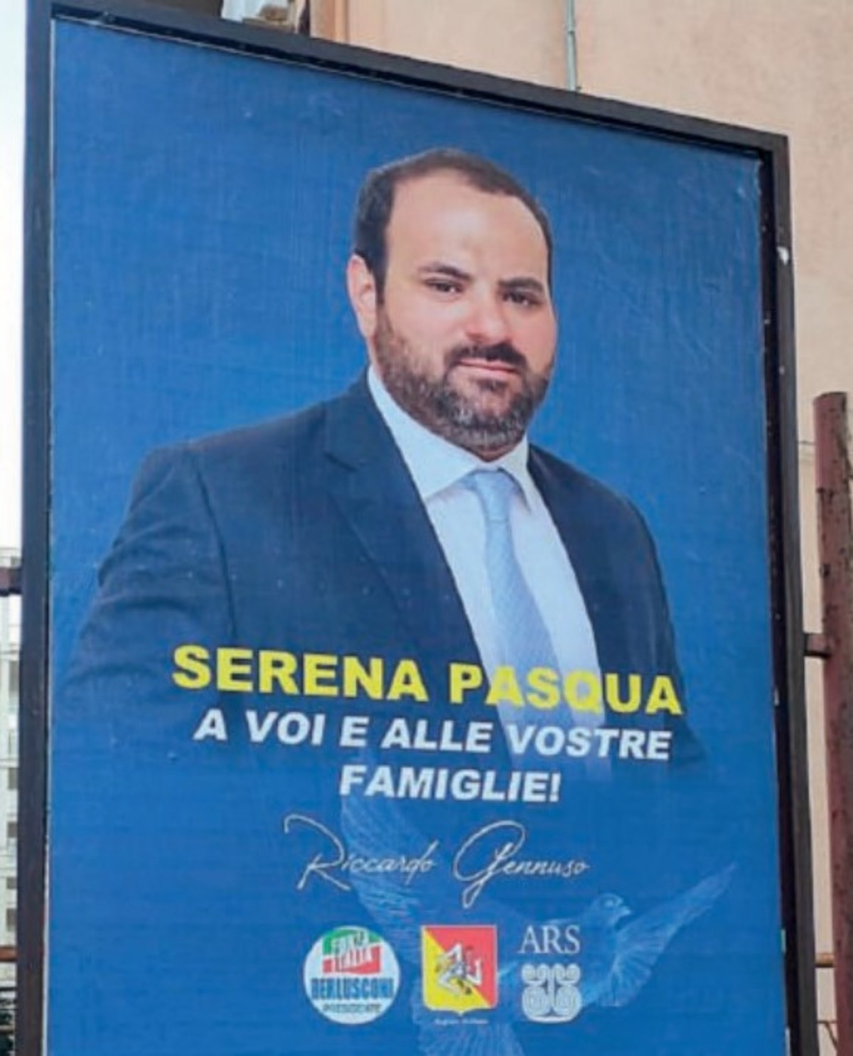 Per questo il caso del deputato regionale di Forza Italia Riccardo Gennuso è diverso. I suoi volto e firma fanno bella mostra su alcuni cartelloni pubblicitari nel Siracusano: «Serena Pasqua a voi e alle vostre famiglie», è il messaggio, che galleggia sopra a una colomba su sfondo azzurrolibertà. Soltanto che l’onorevole di Rosolini, figlio d’arte, fratello d’un altrettanto appassionato forzista, nei suoi manifesti ha aggiunto tre loghi: quello di Forza Italia, e vabbè; quello della Regione Siciliana e quello dell’Ars. Cosa non proprio ortodossa.