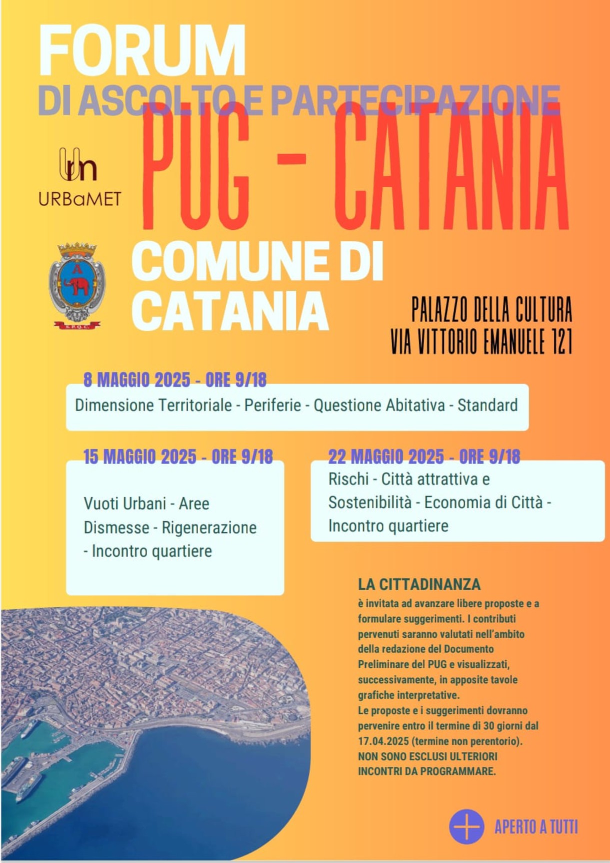 L’amministrazione comunale di Catania ha promosso un forum dedicato al nuovo Piano urbanistico generale (Pug), articolato in tre giornate di ascolto e partecipazione attiva. Il forum, aperto alla cittadinanza, si svolgerà a Palazzo della cultura, nei giovedì 8, 15 e 22 maggio, dalle 9 alle 18.