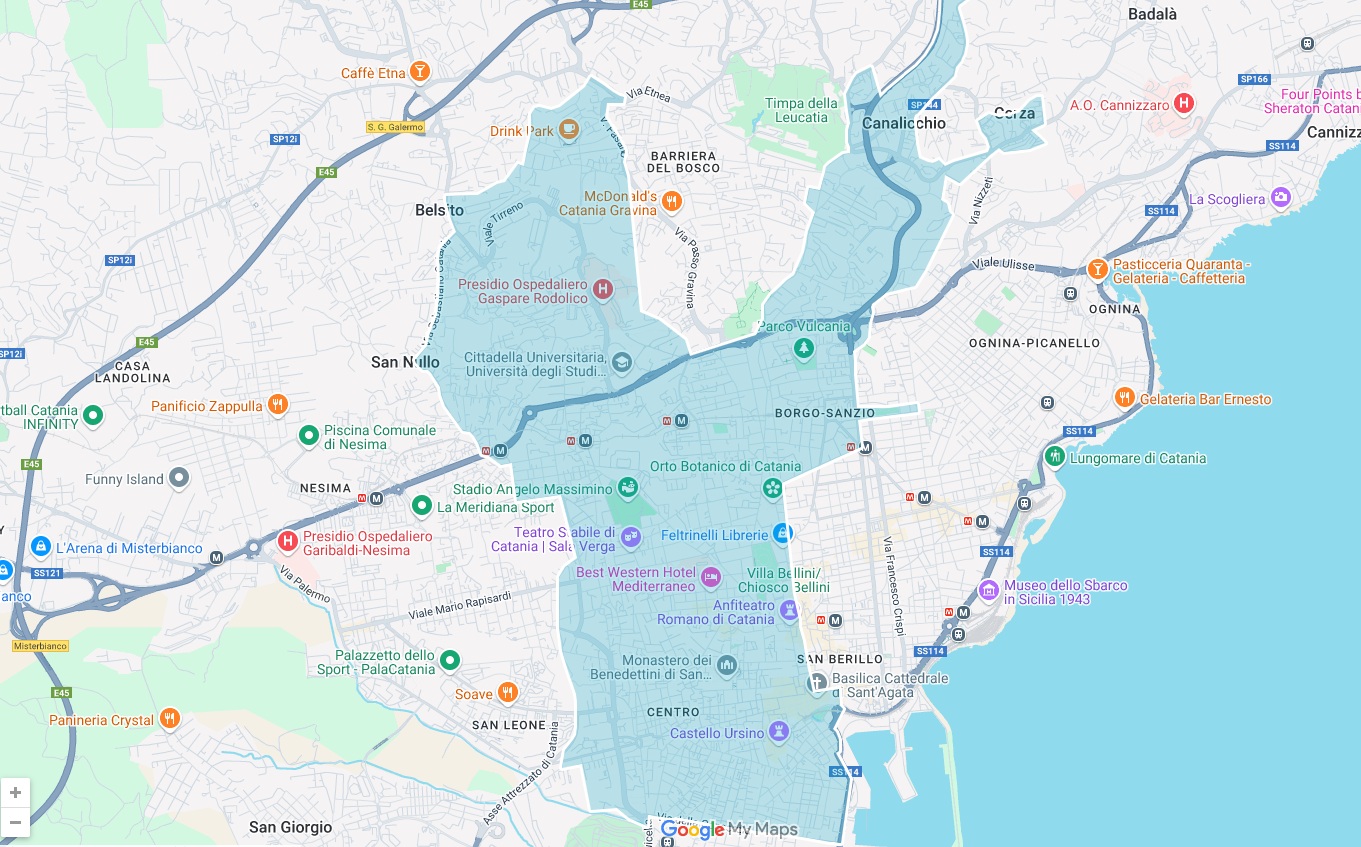 A Catania l’area interessata dai disservizi, in cui ricadono i Quartieri Cibali, Fortino, S. Cristoforo, Angeli Custodi, S. G. Galermo, San Nullo, Civita, Consolazione, Cappuccini, Rapisardi, è individuata tra questi confini: NORD: Circonvallazione di Catania e precisamente viale O. da Pordenone, viale A. Doria, viale F. Vivaldi, viale A. Usodimare; EST: Vie Vincenzo Giuffrida, Ventimiglia, Calì; OVEST: Vie Sebastiano Catania, Merlino, Torresino, Cosentino Sava, Nuova, S.M. Castaldi, Dell’Oro, Curia, Giuseppe Missori, Besana, della Regione; SUD: Via Della Concordia, via SS.M. Assunta;