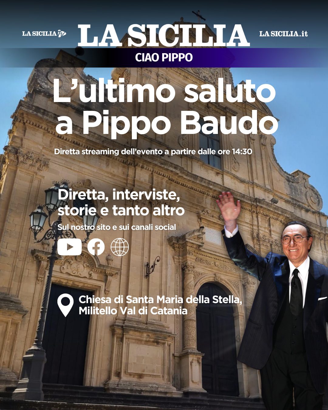 Una diretta sarà fatta dal nostro giornale: dalle ore 14:30 appuntamento sul sito, YouTube e Facebook. Faremo delle interviste tra la gente che aspetta il feretro di Pippo Baudo, e ci saranno in mezzo clip che racconteranno avvenimenti, luoghi e storie che hanno caratterizzato la vita di Pippo Baudo. Successivamente la diretta si sposterà all’interno della chiesa per la celebrazione, uscita e conclusione.