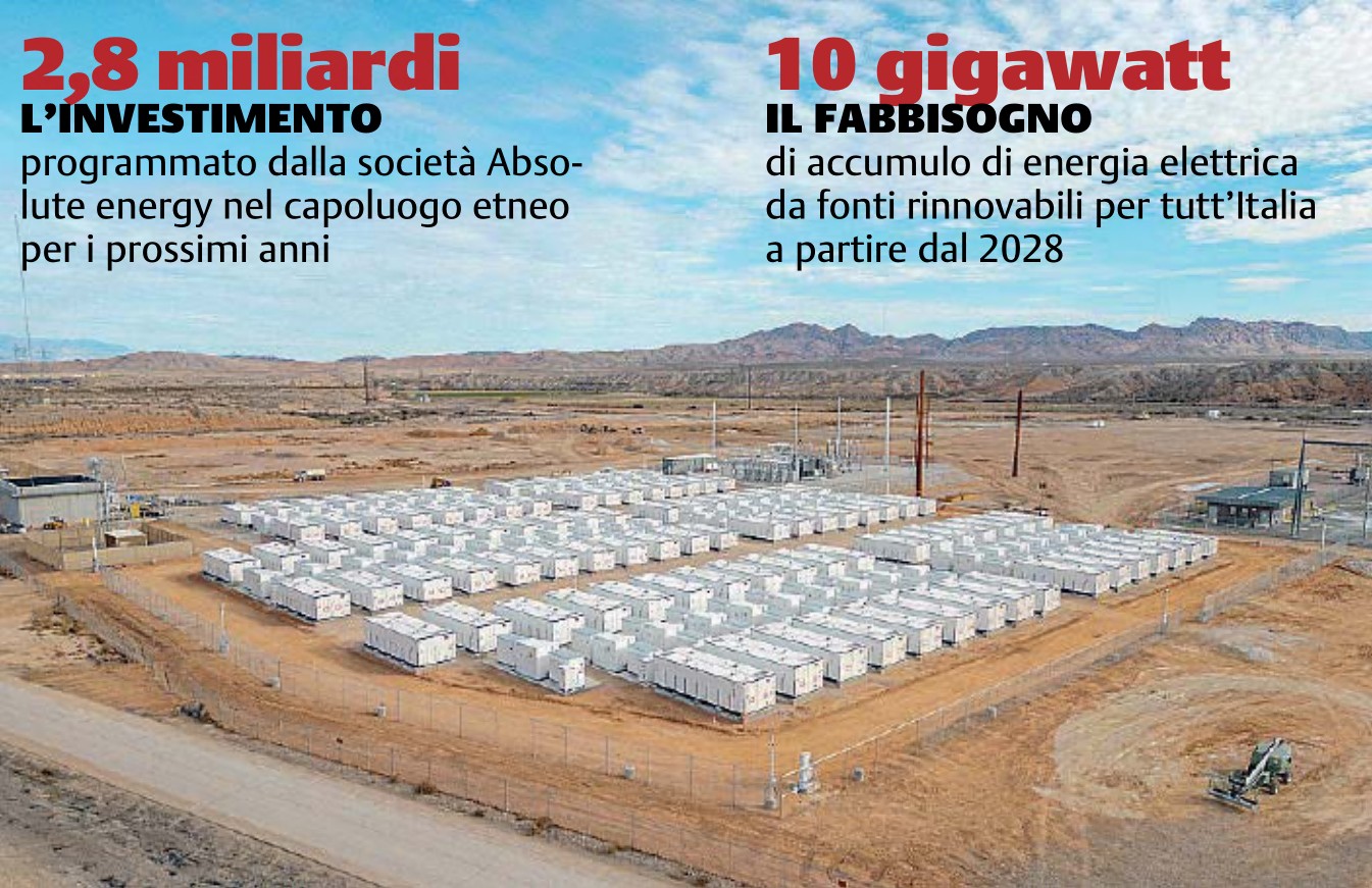 Dall’altra parte del tavolo c’è Egidio Labanca, capo delle operazioni di Absolute Energy, il gruppo che vuole costruire, alla zona industriale di Catania, un gigantesco campo di batterie per l’elettricità prodotta da fonti rinnovabili. Gigantesco significa: 30 ettari di terreno, su cui sarà stampato il passaporto per l’indipendenza energetica di più di tre quarti d’Italia. Se è vero - e la fonte è Terna - che nel 2028 tutto il Paese avrà bisogno di stoccare 10 Gigawatt di elettricità green, i conti con il progetto catanese di Absolute Energy sono presto fatti: l’impianto ha un’autorizzazione per accumulare 8.985,25 Megawatt l’ora, cioè quasi 9 Gigawatt.