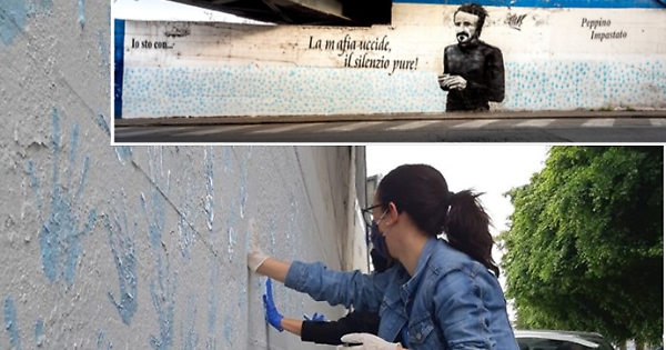 CATANIA - Con l’apposizione delle mani di studenti e cittadini intinte di vernice blu, è stato completato il ripristino del murales dedicato al giornalista Peppino Impastato, ucciso dalla mafia per le sue denunzie contro la delinquenza organizzata. L’ opera artistica realizzata nel 2015 dal club service Interact Catania ovest in collaborazione con l'associazione studentesca Atlas, sulla circonvallazione lato Ognina, alcuni giorni addietro era stata vandalizzata.