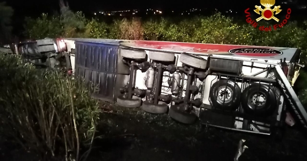 I Vigili del Fuoco del Distaccamento di Riposto, del Comando Provinciale dei Vigili del Fuoco di Catania, sono intervenuti, nella tarda serata di venerdì, per un incidente stradale che si è verificato sull'autostrada A18, sulla carreggiata in direzione Messina, in corrispondenza del tratto compreso tra le uscite di Fiumefreddo e Giardini Naxos. Un autoarticolato che trasportava agrumi, per cause in corso di accertamento, é uscito fuori dalla carreggiata stradale ribaltandosi sulla vegetazione circostante.