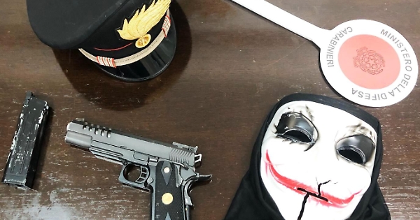Il giovane, infatti, fermato a bordo della sua Smart, è stato trovato in possesso di una dose di marijuana ma poi i militari, nascoste sotto il sedile del guidatore, hanno rinvenuto una maschera a metà tra quella di “Joker” e “Anonymous” (quest’ultimo personaggio del film V for Vendetta) ed una pistola a gas con il caricatore inserito, perfetta riproduzione di un’arma da fuoco, della cui presenza il giovane non è stato però in grado di fornire giustificazione del possesso, pur se ragionevolmente ipotizzabile.