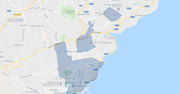Doria, Fleming, Milo, Ala, Ficarazzi, Cifali, Lago di Nicito, Rocca Romana, Orto San Clemente, Reclusorio del Lume, Santa Maddalena, San Giuliano, Crociferi, Auteri, Grimaldi, VI Aprile, Dusmet, Cristoforo Colombo, Africa, Asiago, Giacomo Leopardi, D’Annunzio, Monserrato, S. Pietro, Passo di Aci, Caronda