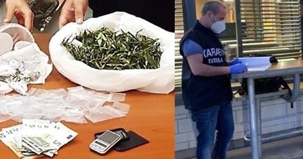Nell’ambito di un servizio finalizzato ai controlli in materia di legislazione speciale e tutela del lavoro, nonché delle misure di contenimento alla diffusione del virus “covid-19” in ambienti di lavoro, i militari hanno effettuato un'ispezione in un bar di via Vittorio Emanuele. Appena entrati nel locale, hanno visto un giovane cliente - segnalato più volte per uso personale di sostanze stupefacenti - alzarsi di scatto da una delle sedie per recarsi in bagno e cercare di disfarsi, inutilmente, di uno spinello appena confezionato. In seguito all'ispezione, i militari hanno rinvenuto e sequestrato: oltre 80 grammi di marijuana, di cui una parte già suddivisa in dosi pronte ad essere smerciate, nascosta all’interno di uno stanzino adiacente al bancone dedicato alla clientela, un bilancino elettronico di precisione, del materiale comunemente utilizzato dagli spacciatori per confezionare le dosi di stupefacente da porre in vendita, 125 euro in contanti, trovati all’interno del portafogli del proprietario del bar, ritenuti il provento dell’attività illecita, nonché una baionetta con lama della lunghezza di 56 cm, trovata invece in casa dell’uomo.