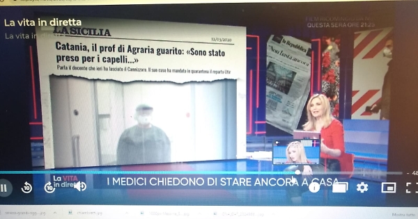 Roma - Nel pomeriggio televisivo di Rai1, quasi interamente dedicato all'emergenza coronavirus, ha trovato spazio anche il caso del prof catanese di Agraria Vincenzo Palmeri, ormai guarito da virus. Alla Vita in diretta, l'intervista al prof da parte di Lorella Cuccarini è stata introdotta con il ritaglio di uno degli articoli che laSicilia.it aveva dedicato all'argomento lo scorso 12 marzo riprendendo l'articolo di Giuseppe Bonaccorsi, pubblicato su La Sicilia.
