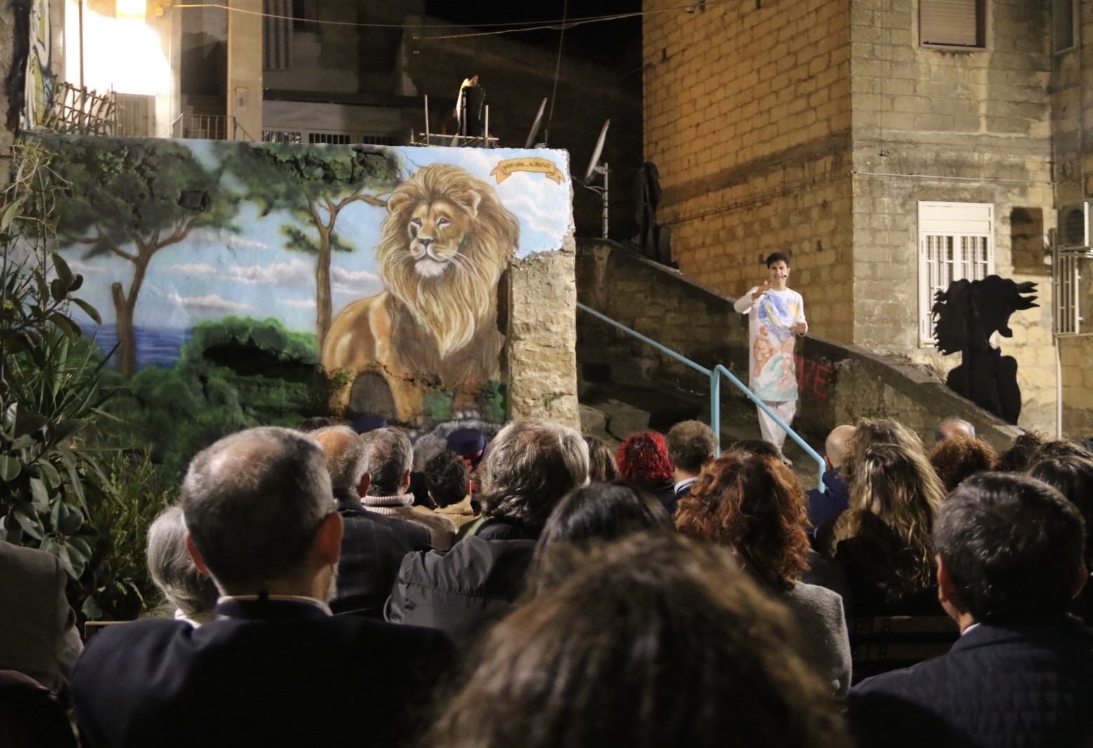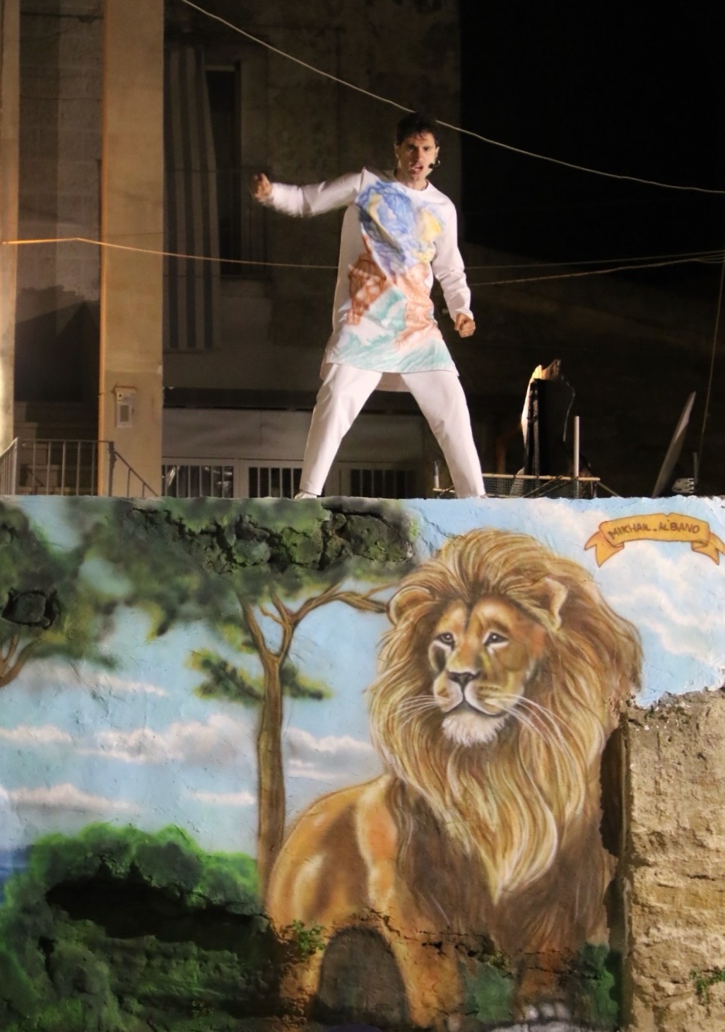 Il Vicolo Sparta, noto come "Cortile dei Giganti" grazie alle maestose opere del maestro lentinese Franco Condorelli, si anima di emozioni già dall’incipit dello spettacolo, custodendo un messaggio profondo: