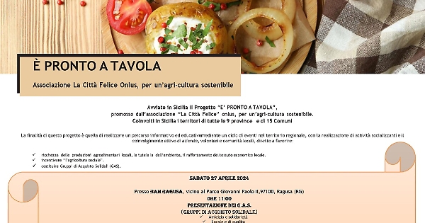 Nuovi orizzonti per l'agricoltura siciliana con il progetto "È pronto a tavola" ideato dall’associazione La Città Felice Onlus con il patrocinio del Ministero del lavoro e delle politiche sociali e della Regione Siciliana e in collaborazione con il MCL- Sicilia e il circolo di MCL di Mineo “Rosario Pepe” che il prossimo 27 aprile farà tappa al BAM di Ragusa, adiacente al Parco Giovanni Paolo II di Ragusa, per offrire un’esperienza sensoriale all’insegna dell'agri-cultura sostenibile.