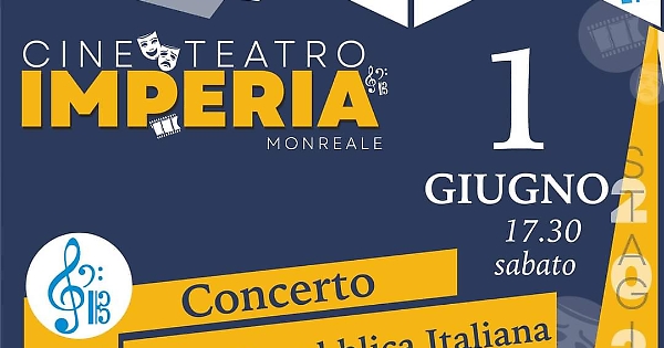 Giunge così quasi al termine la programmazione del Cine Teatro Imperia di Monreale con l’ultimo appuntamento della stagione in programma il 1° giugno, alle ore 17:30, con la Banda "I Fiati della Normanna" che chiuderà ufficialmente la prima stagione del Cine Teatro Imperia con lo spettacolo "Concerto della Repubblica Italiana". Concerto con brani sinfonici, arrangiamenti di musica pop e un brano per pianoforte e banda. Dirige il Maestro Aldo Terzo. Nel ventesimo secolo giovani e meno giovani musicisti, avvolti da un'aria di rifondazione e modernizzazione, spinti da comuni idee e dal senso di appartenenza, crearono il 12 settembre 2016 il Corpo Bandistico Musicale "I Fiati della Normanna" città di Monreale. La neo-banda musicale è saldamente e fortemente presente nel territorio, ma altrettanto protagonista in manifestazioni regionali per l'ambizione che la caratterizza. Prima banda del paese con patrocinio comunale ottenuto nel 2017. Lo scopo della neo-associazione è quello di condividere e divulgare la propria melodia, la propria interpretazione musicale, ma soprattutto l'obbiettivo primario è quello di far sopravvivere e incentivare il mondo della banda musicale, tutelare e custodire questo patrimonio.