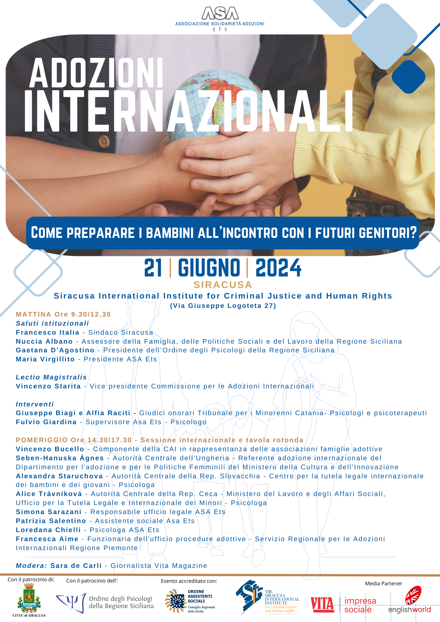 Siracusa - “Adozioni internazionali: come preparare i bambini all’incontro con i futuri genitori?” è il titolo del convegno organizzato dall’associazione ASA ets (Associazione Solidarietà Adozioni) venerdì 21 giugno alle ore 9:30 presso il Siracusa International Institute for Criminal Justice and Human Rights (Via Giuseppe Logoteta 27), con il patrocinio gratuito del Comune di Siracusa e dell’Ordine degli Psicologi della Regione Siciliana.
