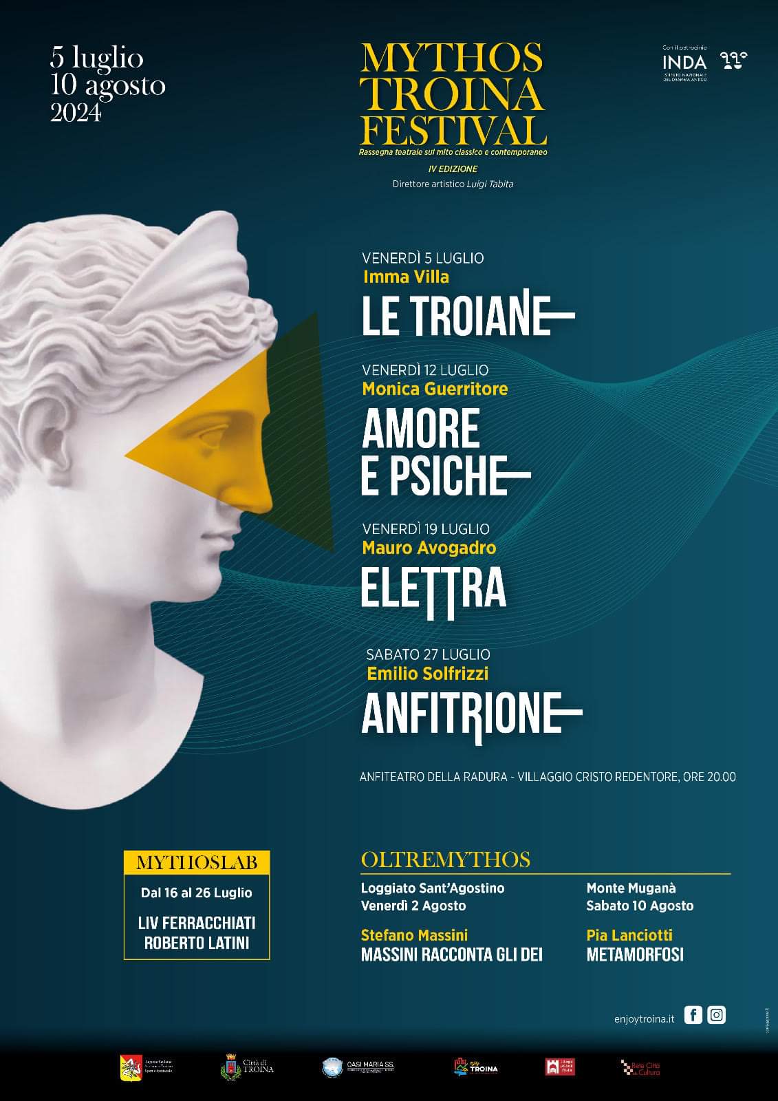 Dopo il grande successo registrato con “Le Troiane” di Carlo Cerciello, il secondo appuntamento del Mythos Troina Festival vedrà protagonista Monica Guerritore, una delle più importanti attrici del teatro italiano.Nel suggestivo Anfiteatro della Radura - Villaggio Cristo Redentore venerdì 12 luglio alle 20.00, andrà in scena lo spettacolo Amore e Psiche, distribuito da AidaStudioProduzioni, con il coordinamento artistico di Elena Marazzita.  Presentazione spettacolo:Monica Guerritore interpreterà un’affascinante favola che racconta l’attrazione verso la divinità (Dio), la sete di conoscenza e l’insistente ricerca di “sacro” che è presente nell’uomo di tutte le epoche. Ma alla divinità ci si accosta con umiltà, con fede. C’è bisogno di quel cambiamento di prospettiva, quell’azzeramento del già conosciuto che viene da sempre raccontato nelle fiabe “caduta-conversione- risalita”.Le prove come cambiamento dell’orientamento interiore, un’inversione di rotta. Il desiderio di una maggior consapevolezza (che essendo osteggiata costituisce già in sé un ulteriore prova) “Voglio vedere…voglio sapere…voglio conoscere…” dirà Psiche. Solo dopo la caduta, precipitata alla massima distanza dal luogo che costituisce la meta ultima, lo sguardo, la conoscenza sarà in grado di percepire e congiungersi fondendosi al Dio L’Immenso. L’Indicibile. Le tracce musicali parleranno al cuore degli spettatori accompagnando l’affannosa ricerca/fuga di Psiche.Le attività del Mythos Troina Festival continuano con numerose novità volute dal Direttore Artistico Luigi Tabita che, per la prima volta, ha inserito dei momenti dedicati alla formazione. Infatti, dal 16 al 26 luglio, vi saranno due laboratori teatrali rivolti a professionisti nazionali ed internazionali che, per l’occasione, alloggeranno per due settimane a Troina. Il primo sarà diretto da Liv Ferracchiati, autore e regista italiano pluripremiato, tra i più apprezzati della scena contemporanea, che curerà un laboratorio dal titolo “Chi ha paura dei classici”. Il secondo laboratorio sarà diretto dall’eclettico regista e performer Roberto Latini, che avrà come titolo "Di forme mutate in corpi nuovi".Il prossimo appuntamento in cartellone è in programma venerdì 19 luglio con i giovani talenti dell’Accademia dell’Istituto Nazionale del Dramma Antico, diretti dal maestro Mauro Avogadro, che presenteranno al pubblico uno studio sulla figura di Elettra, protagonista di grandi opere letterarie e teatrali, dall’antichità ad oggi.